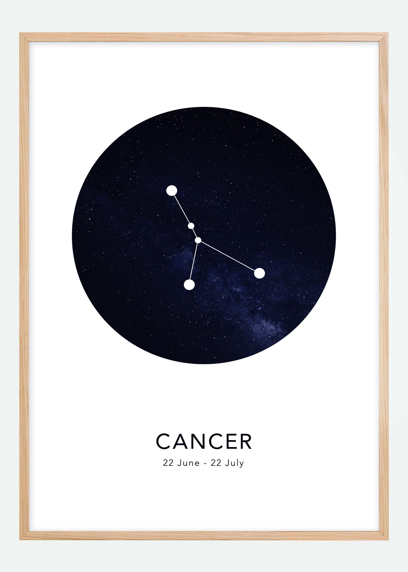 Anna kellelegi, kellest hoolid, isiklik pilt! See stiilne plakat kujutab Vähk tähemärki musta ja sinise tähetaeva taustal. Allpool on nimi koos kehtivate kuupäevadega inglise keeles.
