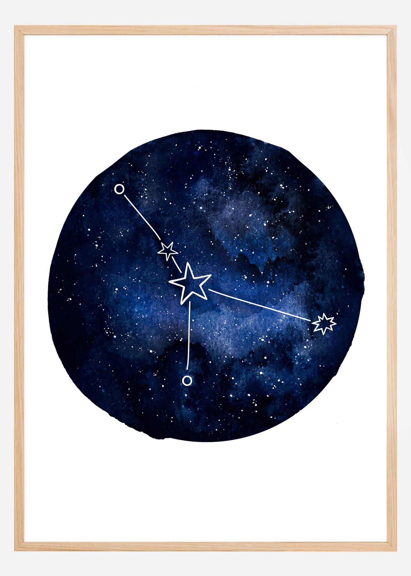 Horoskoopiposter Vähi tähemärgiga. Tumesinine ring täidab selle valge pildi keskkoha. Ringi sees on erinevad sinise toonid ja tähed. Vähi tähemärk on keskel silmapaistev. Kui sa armastad oma tähemärki, on see pilt kohustuslik sinu seinal.