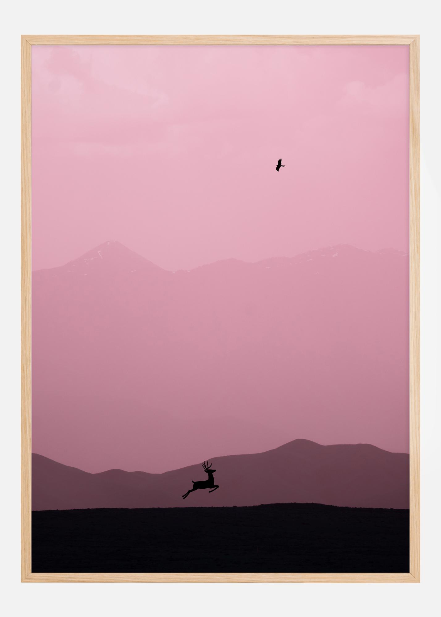 See vaikne ja unistav plakat haarab vabaduse ja ilu olemust looduses. Siluett hirvest, kes hüppab pehmete, lainetavate küngaste kohal, annab liikumise ja kerguse tunde. Üle kõige ulatub õrnalt roosa taevas, mis lisab soojust ja imet. Üksildane lind lendab taeva lõpmatuse poole, lisades pildile täiendava vabaduse ja piiranguteta olemise mõõtme.
