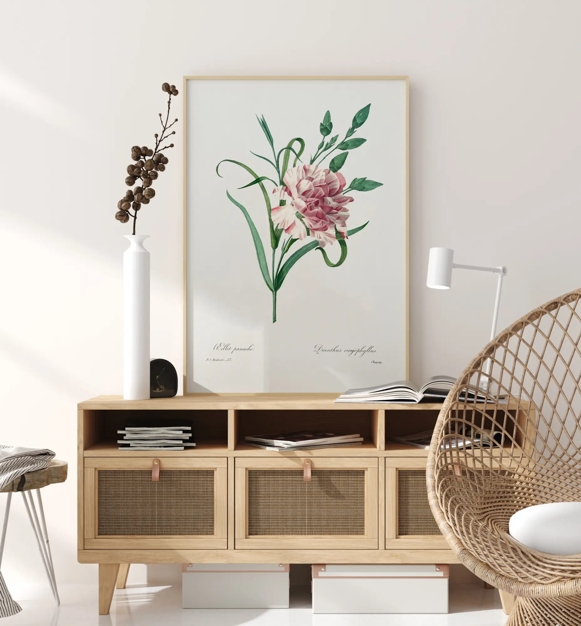Botaaniline plakat roheliste lehtede ja roosa-valge nelgiga. See illustratiivne pilt eristub valgel taustal, mis võimaldab näidata kõiki detaile. Riputage see teos kodus üles, et imetleda aiandushuviliste ja loodusesõprade poolt.
