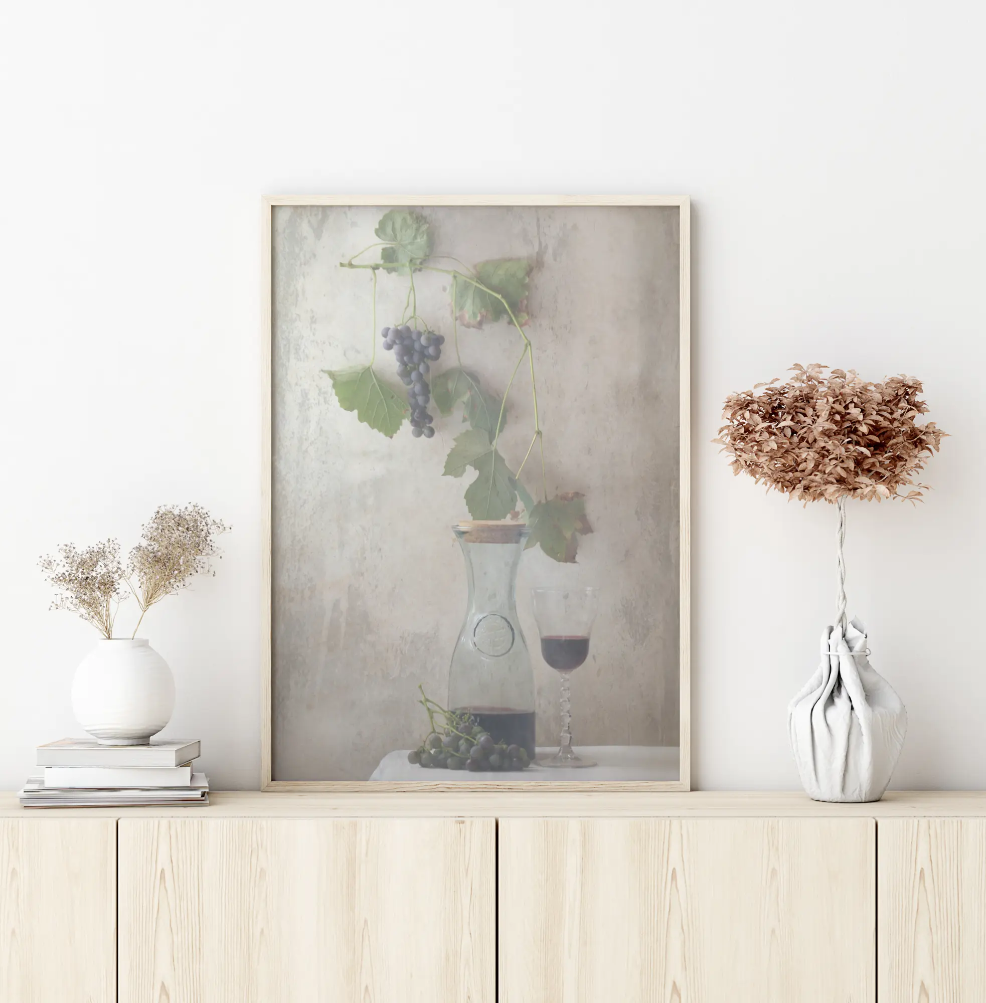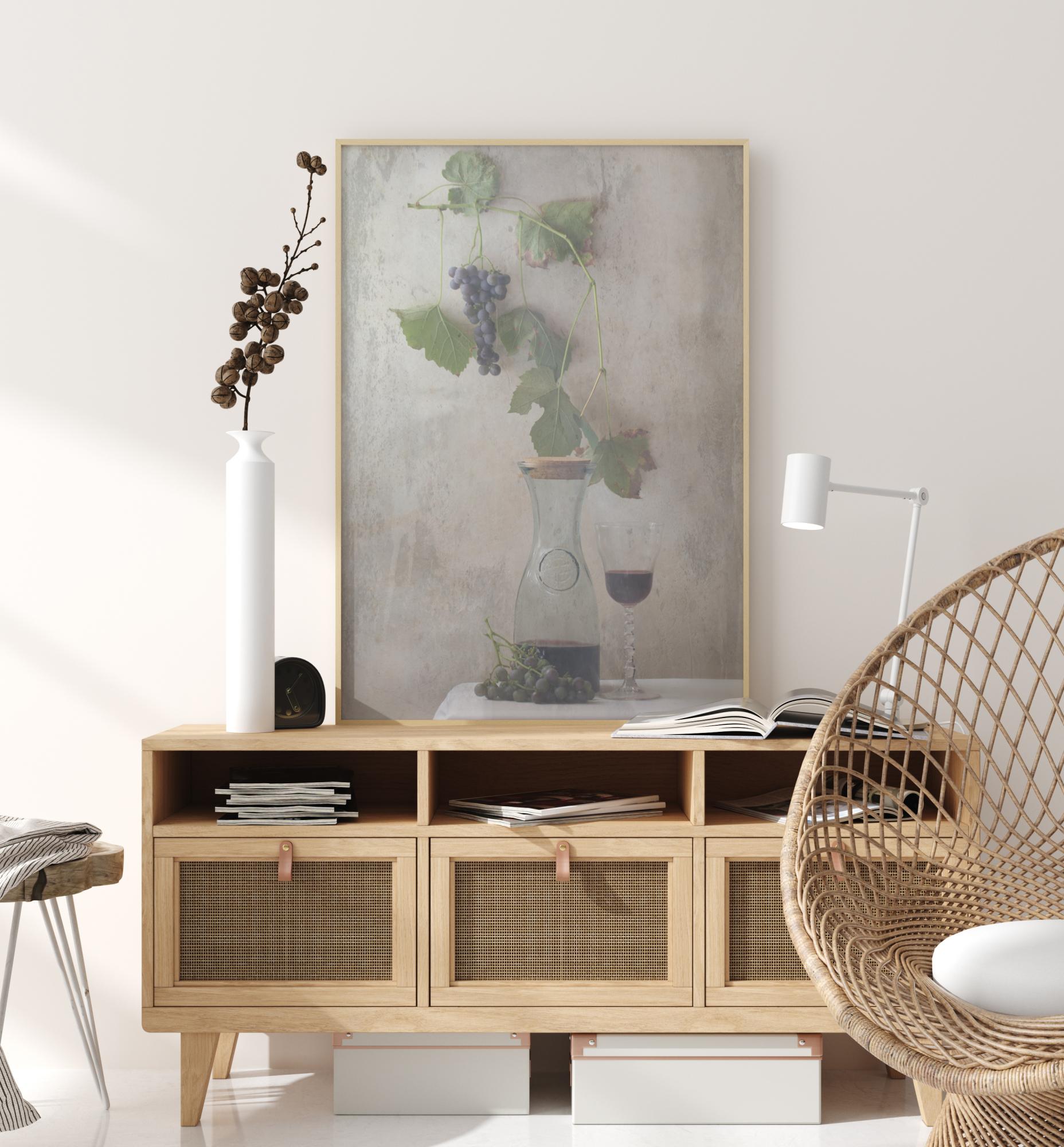 Natüürmort plakat käsitööveini karahviniga, veinipokaaliga ja väikese viinamarjaoksaga. Tumedad lillad viinamarjad ja rohelised lehed asetsevad lihtsal hallil seinal, mis muudab need silmapaistvaks. Tunne end Rooma villas, kui see elegantne, kuid lihtne teos kodus ripub.