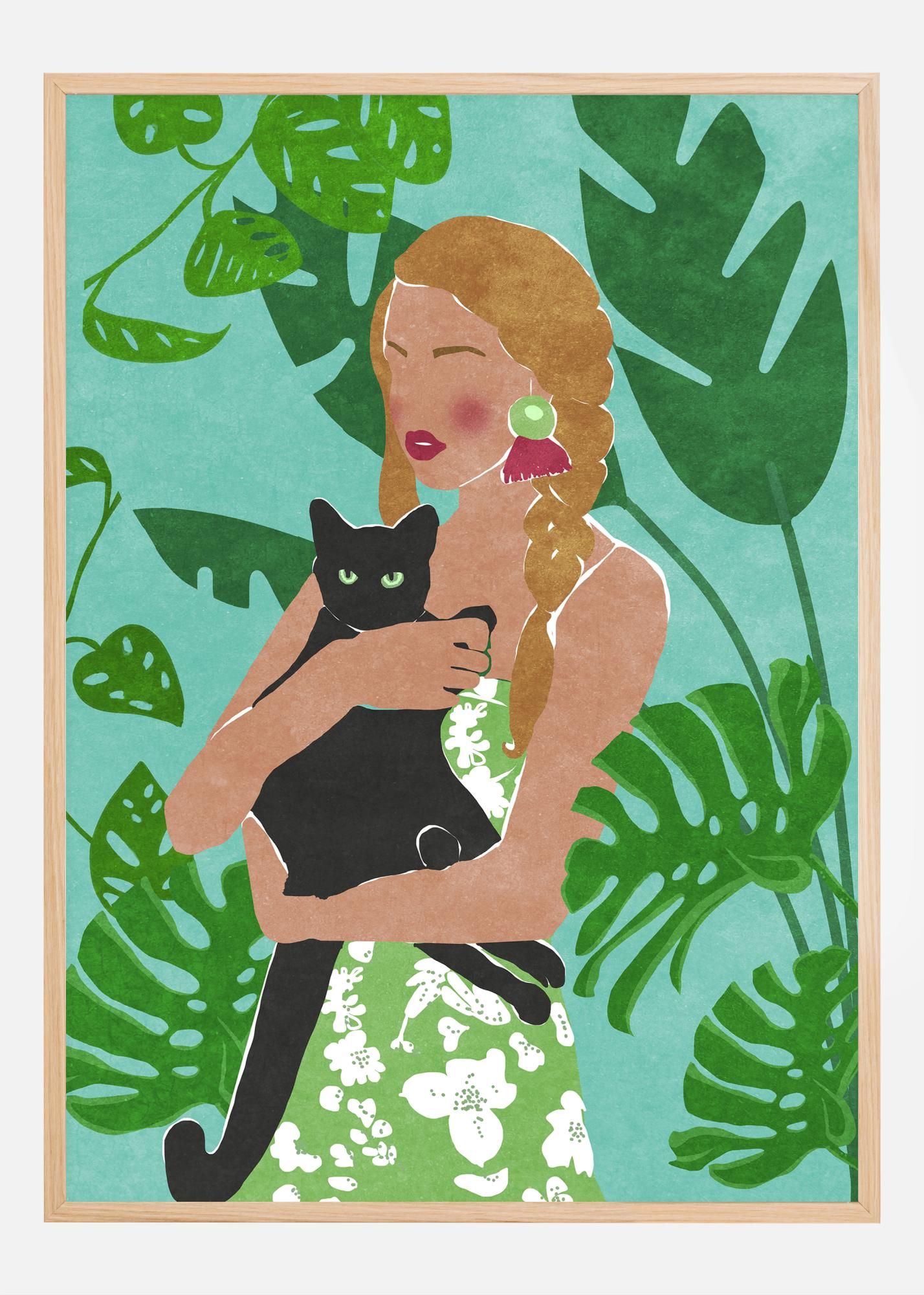See võluv plakat püüab iga kassisõbra südame oma sooja ja kutsuva illustratsiooniga. See kujutab naist, kes hoiab armastavalt oma musta kassi, ümbritsetuna lopsakast lehestikust. Motiiv kiirgab harmooniat ja kogukonda, edastades kindlustunde ja lõõgastuse tunnet. Prinditud plakat on ideaalne neile, kes soovivad tuua tükikese loodust ja loomaarmastust oma koju ning luua oaasi, kus nii inimesed kui ka lemmikloomad saavad hästi tunda.