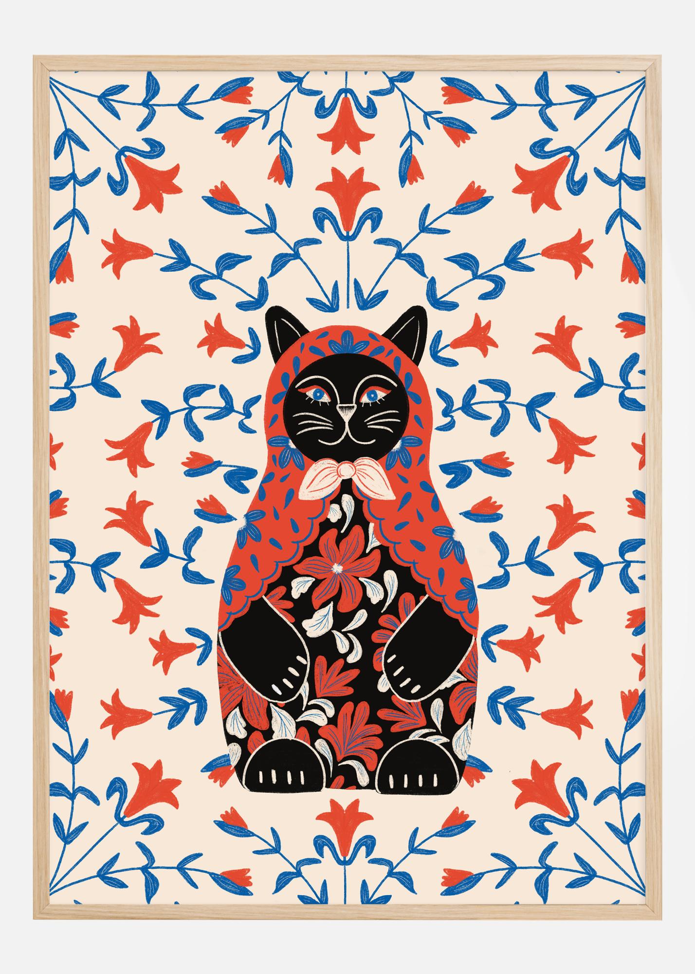 See värvikas ja elav plakat on klassikalise vene matrjoška moodne tõlgendus, kujutades selle ümber mõelduna majesteetliku kassi kujuna, mis istub keskel, ümbritsetud lopsaka lilleaiaga. Kassi pilk on läbistav ja salapärane, samas kui selle karv on rikkalikult kaunistatud keeruliste lillemustritega. Kassi ümber laotub punaste ja siniste lillede meri kreemikas taustal, luues peaaegu hüpnootilise mustri, mis on nii lummav kui ka ilus.