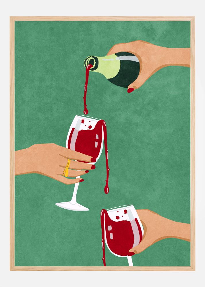 See lõbus ja rafineeritud plakat tabab sõpruse ja tähistamise olemust. Illustratsioonil on kujutatud kolm kätt, mis elegantselt hoiavad veinipokaale ja pudelit, kust just valatakse punast veini ühte klaasi. See stseen on austusavaldus väikestele hetkedele, mis teevad elu eriliseks, ja on ideaalne valik neile, kes soovivad oma koju tuua ühtekuuluvuse ja pidulikkuse tunnet. Plakat on sama palju vestluse alustaja kui dekoratiivne sisekujunduselement.