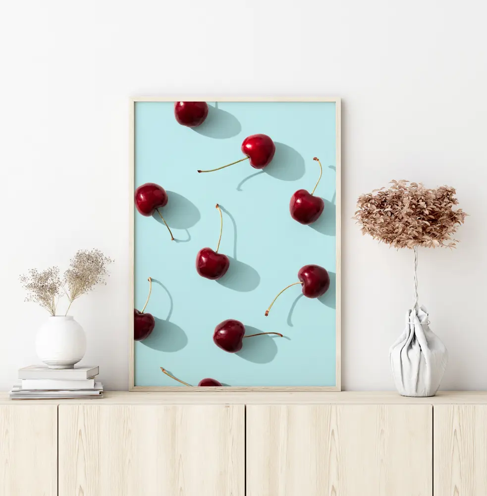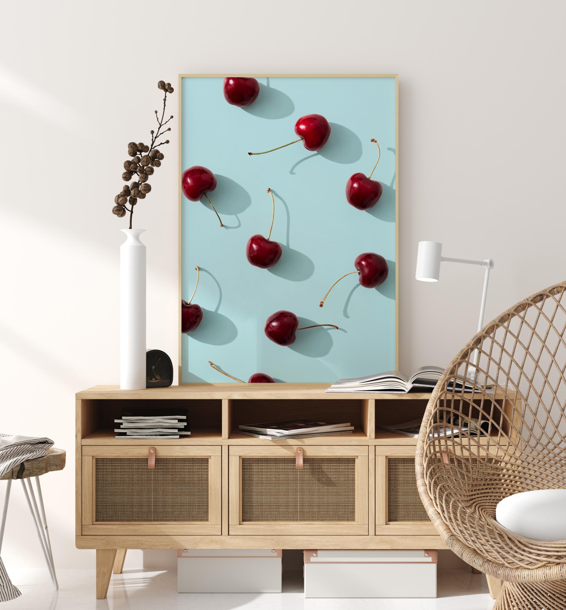 Puuviljaplakat, millel on kaheksa kirssi pehmelt sinisel taustal. Eredad punased kirsid ja nende varred heidavad varje lihtsa türkiissinise lauaplaadi peale, millel need asuvad. Tuleta endale meelde oma viis päevas selle mahlaka pildi abil, mis ripub sinu köögis.