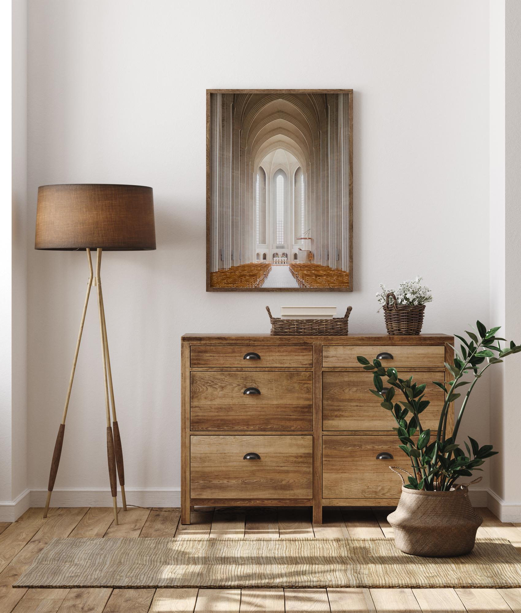 Romantiline poster kiriku interjöörist. Helepruunid toolid ääristavad käiku pikkade ridadena mõlemal pool. Gooti kaared raamivad teost, suunates pilgu kirikukäigu lõpus oleva heleda valge valguse poole. Käi kirikus kodust lahkumata, kui sul on see religioosne poster kodus rippumas.