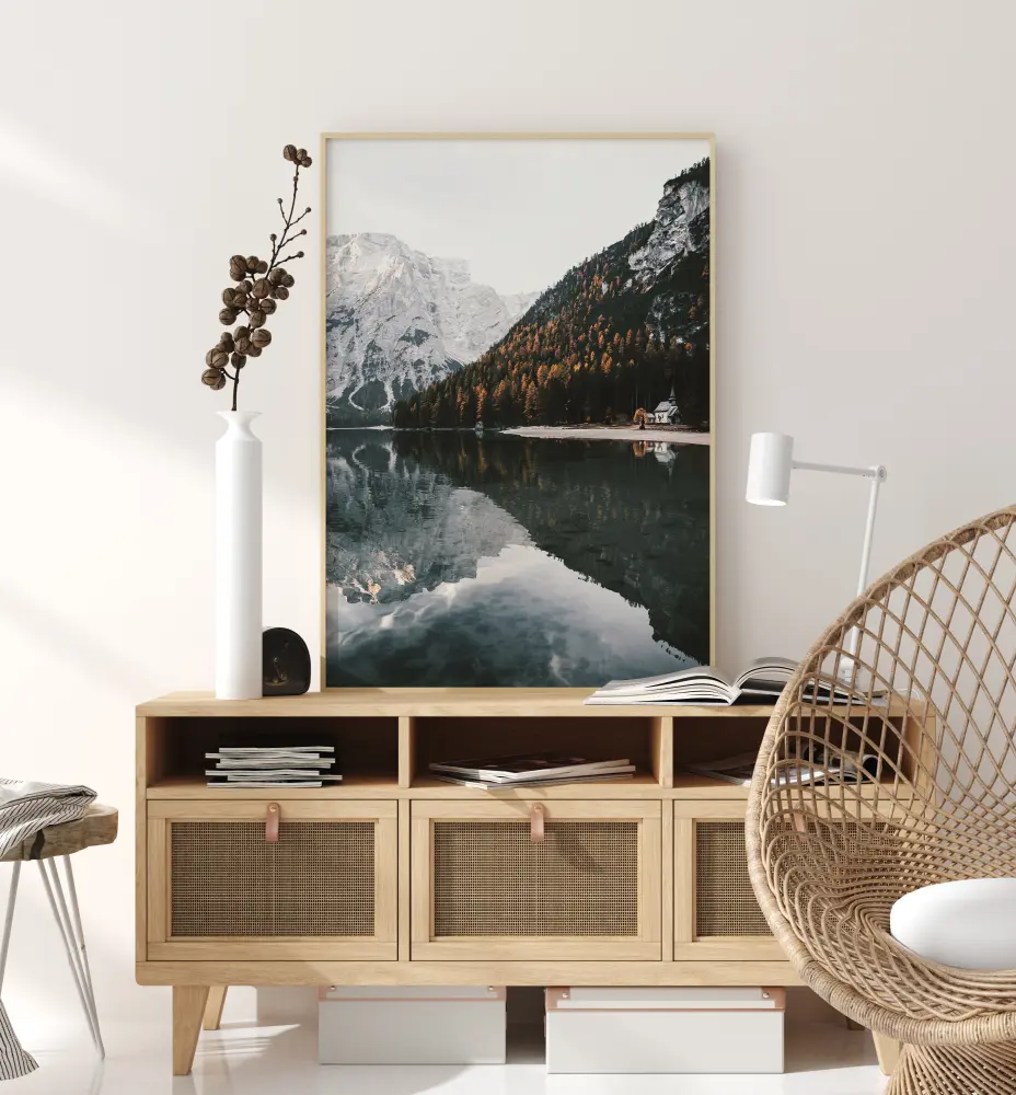Eepiline plakat mäestikust, mille keskel asub väike kirik metsas. Naudi selle lumise maastiku suursugusust, kus mäed peegelduvad rahulikus järves. Sügisekollased puud ääristavad mägesid ning väike valge kirik seisab jalamilt. Lase end inspireerida, kui vaatad looduse imet.
