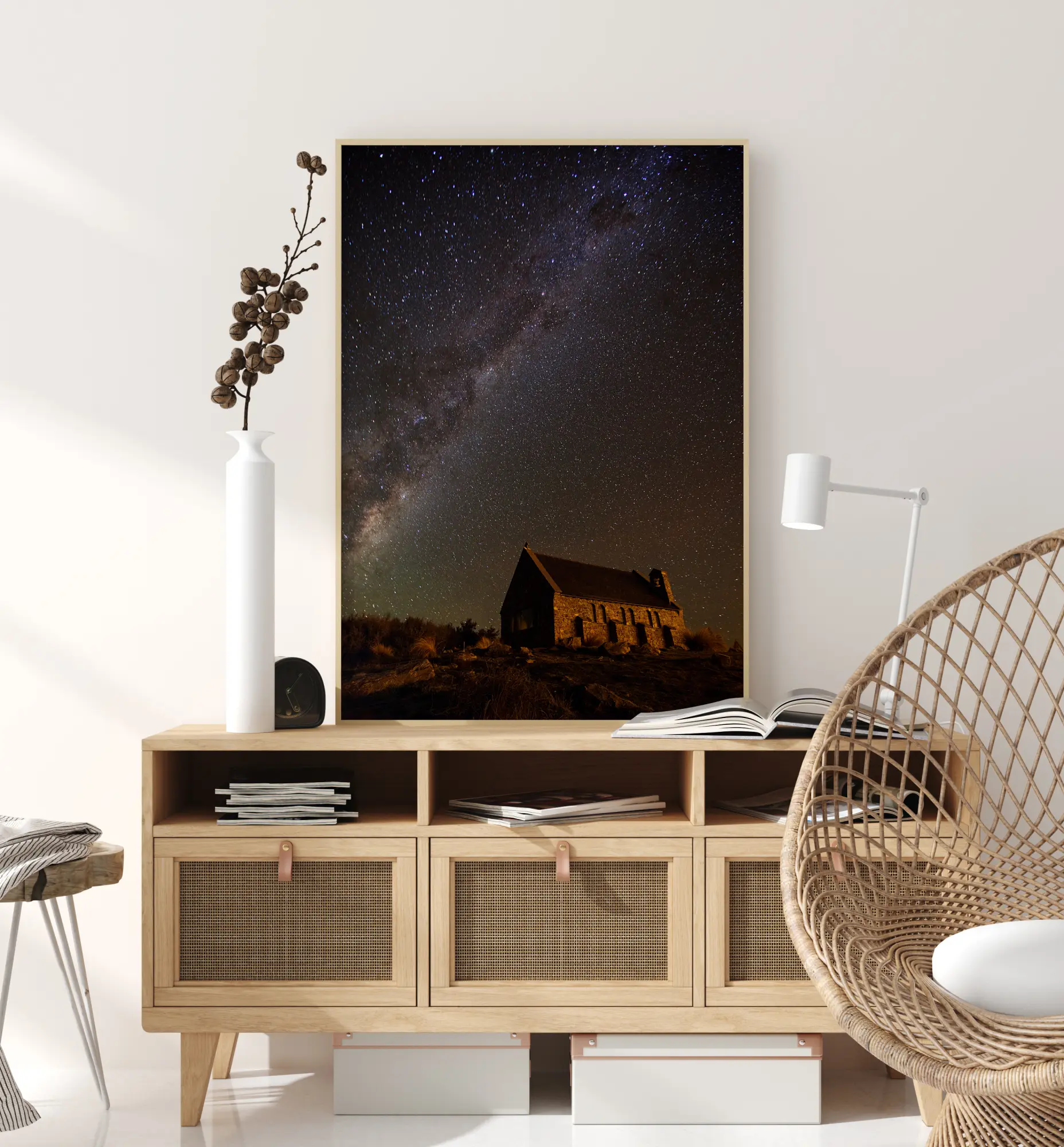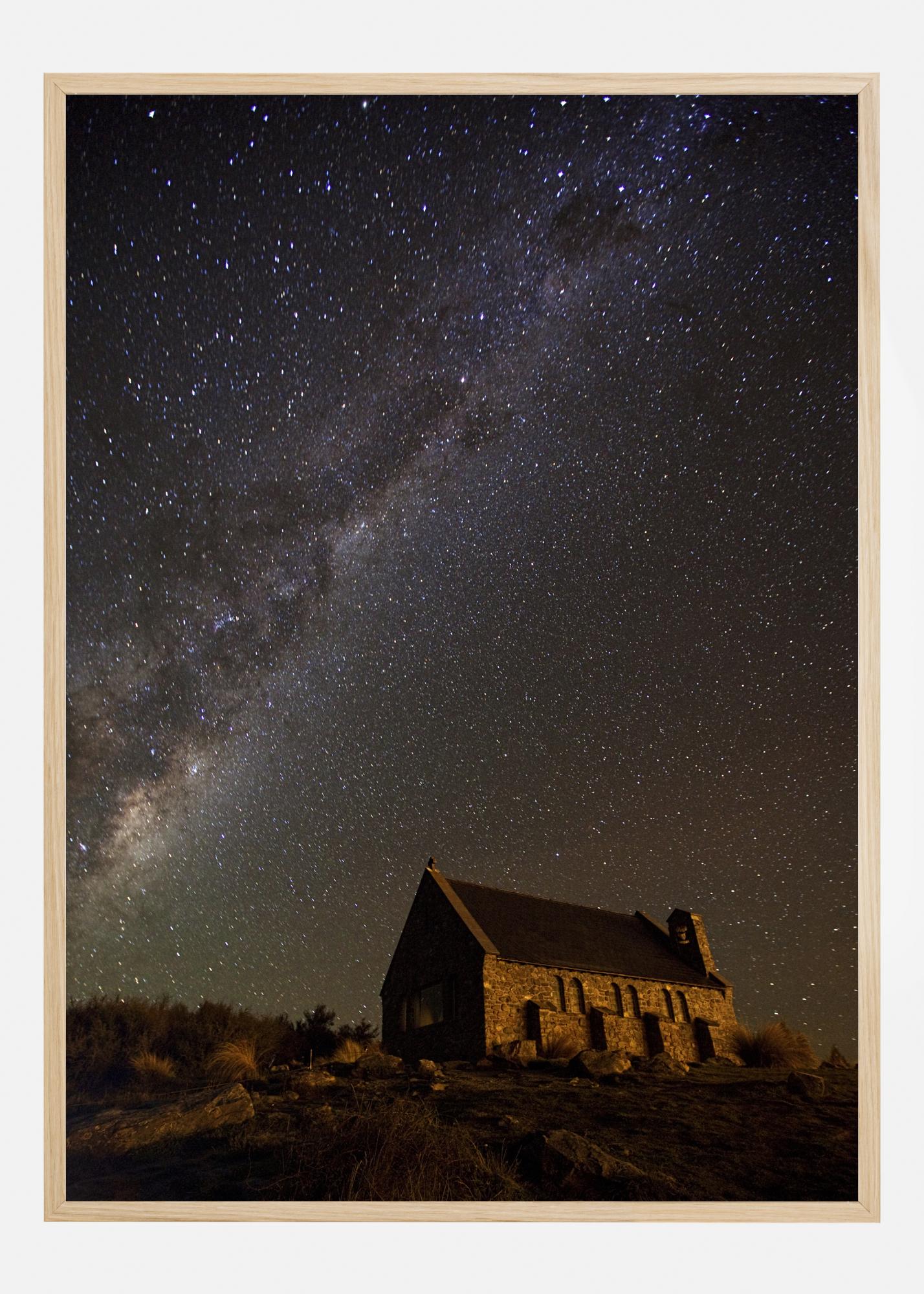 Religioosne plakat vanast kivikirikust koos Linnuteega taustal. Rustikaalne kirik on valgustatud pehme valgusega künkal. Hele öötaevas on täidetud väikeste tähtedega, mis moodustavad meie galaktika ülalpool. Tunne aukartust meie universumi ees selles pildis.