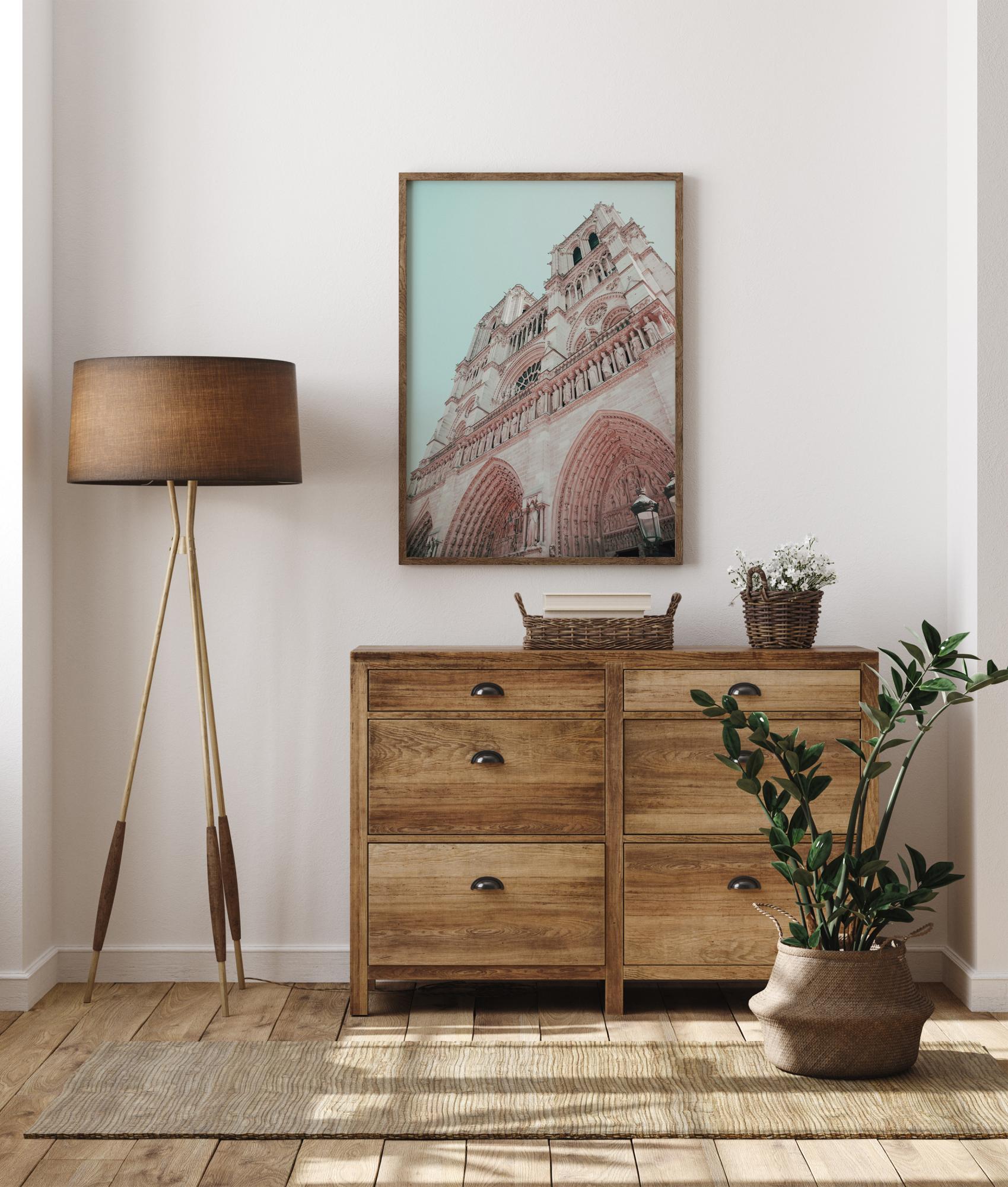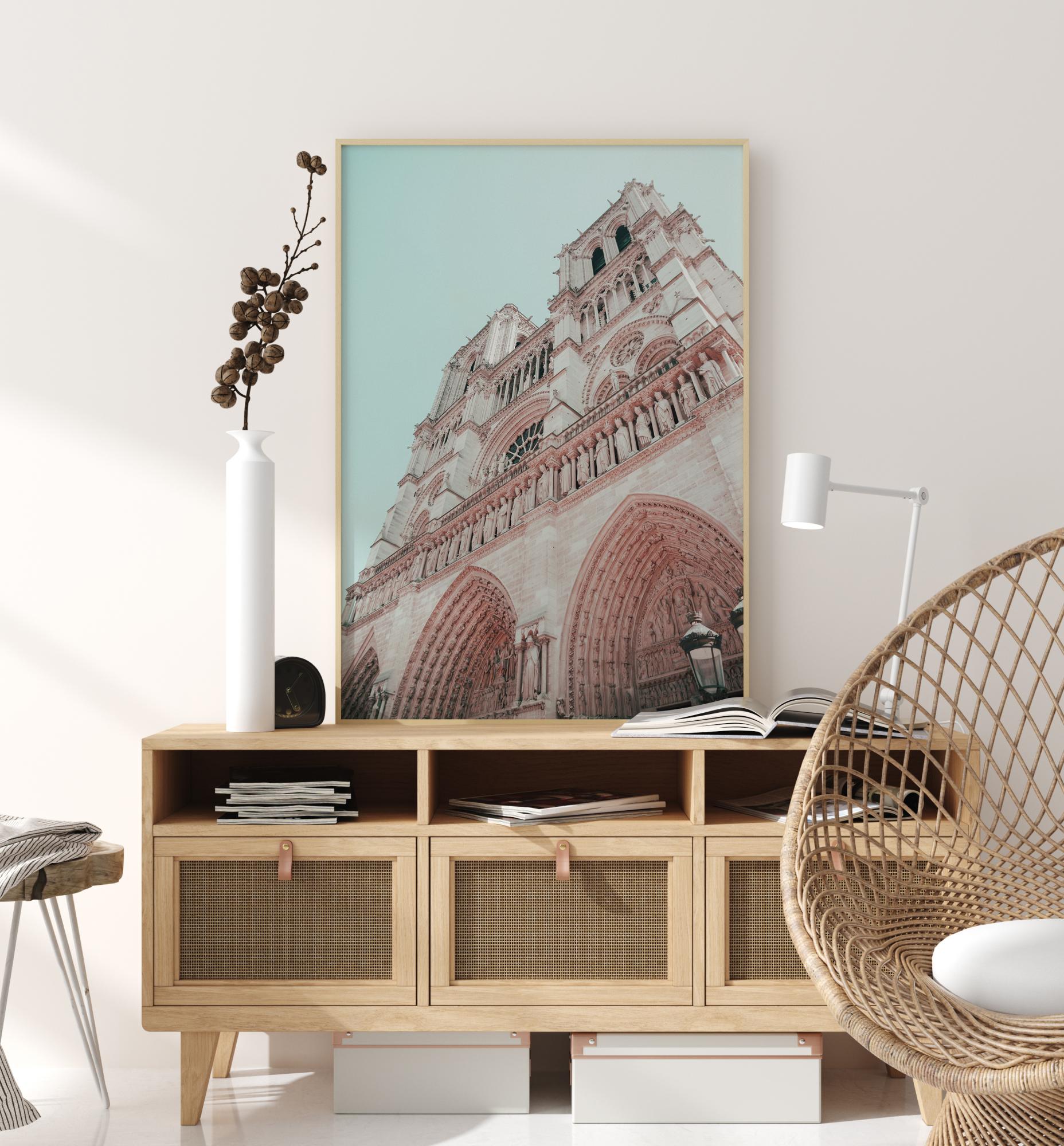 Dramaatiline plakat kiriku fassaadist. Vaadake üles mööda seda valget ja roosat hoonet, millel on gooti kaared, kivist kujud ja ümmargused aknad. Pehmed pastelltoonid loovad harmoonilise tunde, mis on ideaalne viis kodus rahustava atmosfääri loomiseks.