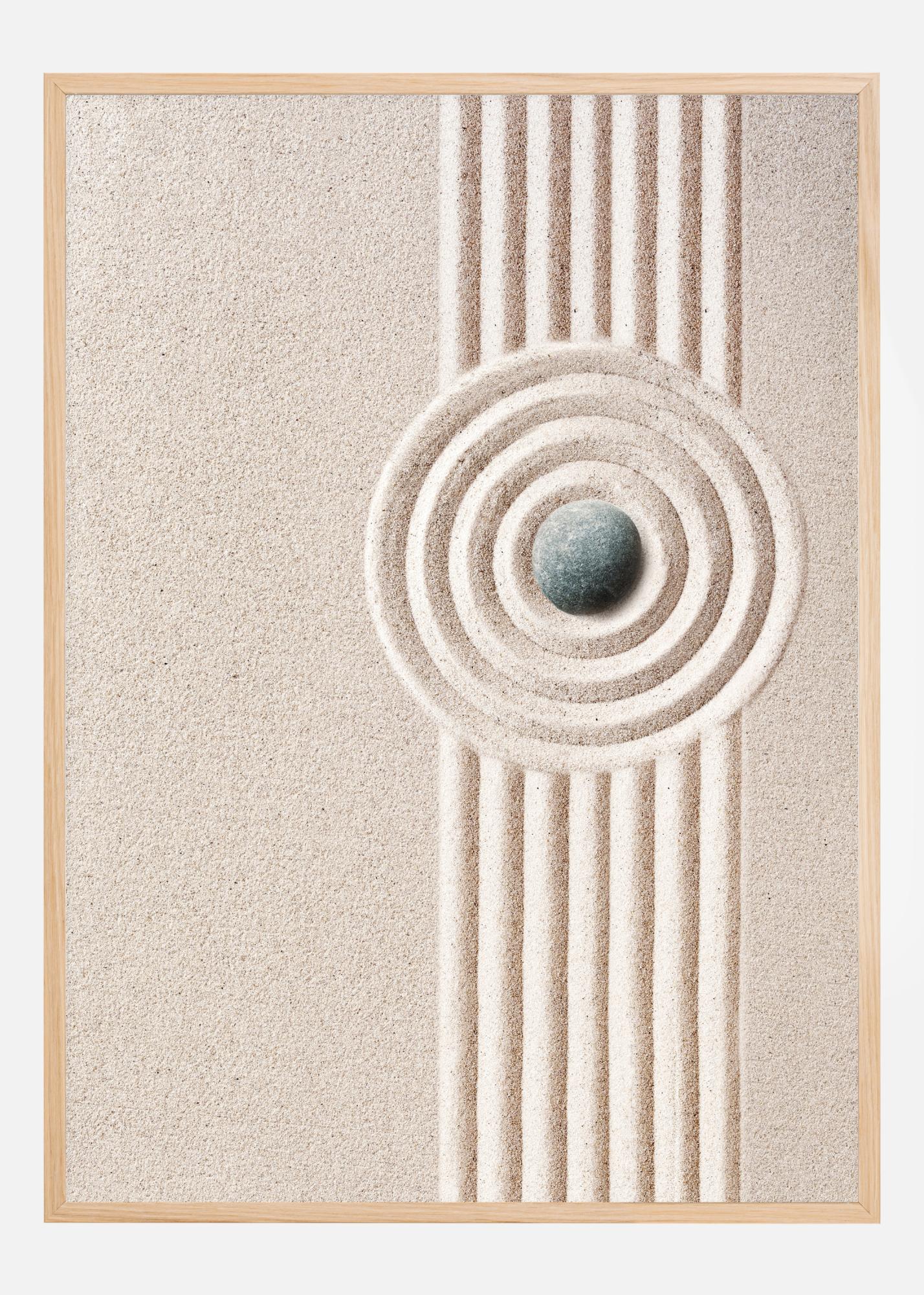 Geomeetriline plakat liivavormidega. Liivas on tõmmatud seitse vertikaalset joont, mida lõikab täpne ring viie rõngaga. Keskel asub üks sinakashall kivi. Imestage selle elegantse, geomeetriliste vormidega plakati täiuslikkuse üle.