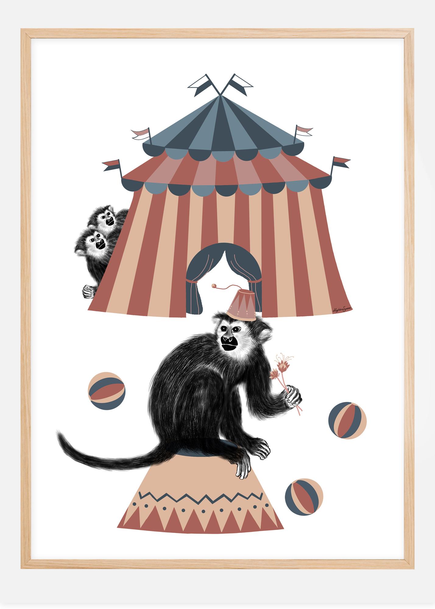 Lõbus poster tsirkuseahvide ja tsirkusetelgiga. Üks ahv istub taburetil, kannab fez-mütsi ning hoiab lilli. Allpool on kolm palli. Veel kaks ahvi peidavad end tsirkusetelgi taga. Anna oma kodule vürtsi selle pildiga seinal.