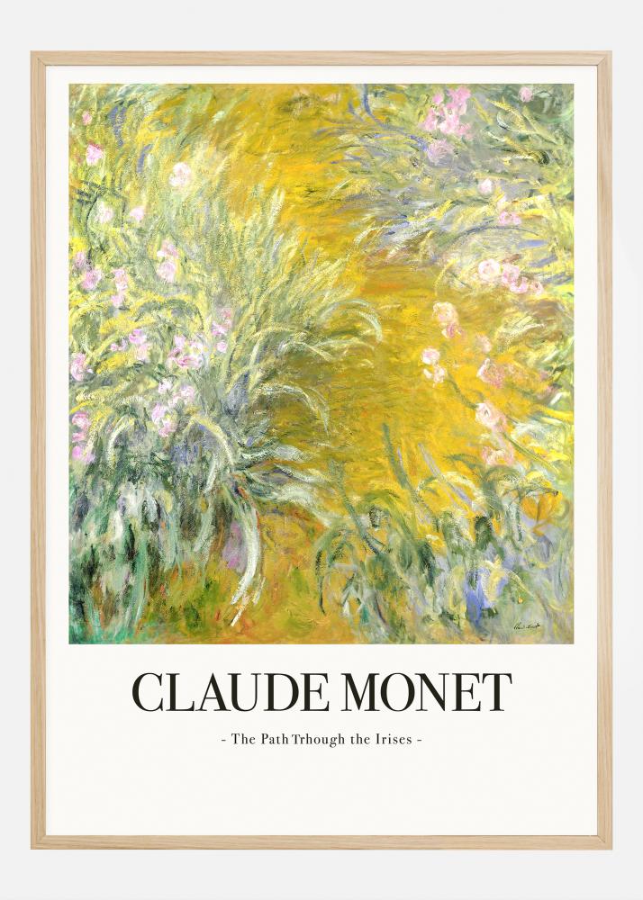 Postri pealkiri, 'Teekond läbi iiriste', tutvustab meile Claude Monet' nägemust oma aiast, kohast, mis andis talle lõputut inspiratsiooni. See maal, mis voolab elavate kollaste ja roheliste toonidega, täiendatuna iseloomulike lilla ja roosa iiristega, köidab vaataja pilgu ning kutsub jalutama mööda nähtamatut teed. Monet' allkiri on diskreetselt paigutatud nurka, mis suurendab kunstiteose autentsust ja selle ajaloolist tähtsust.