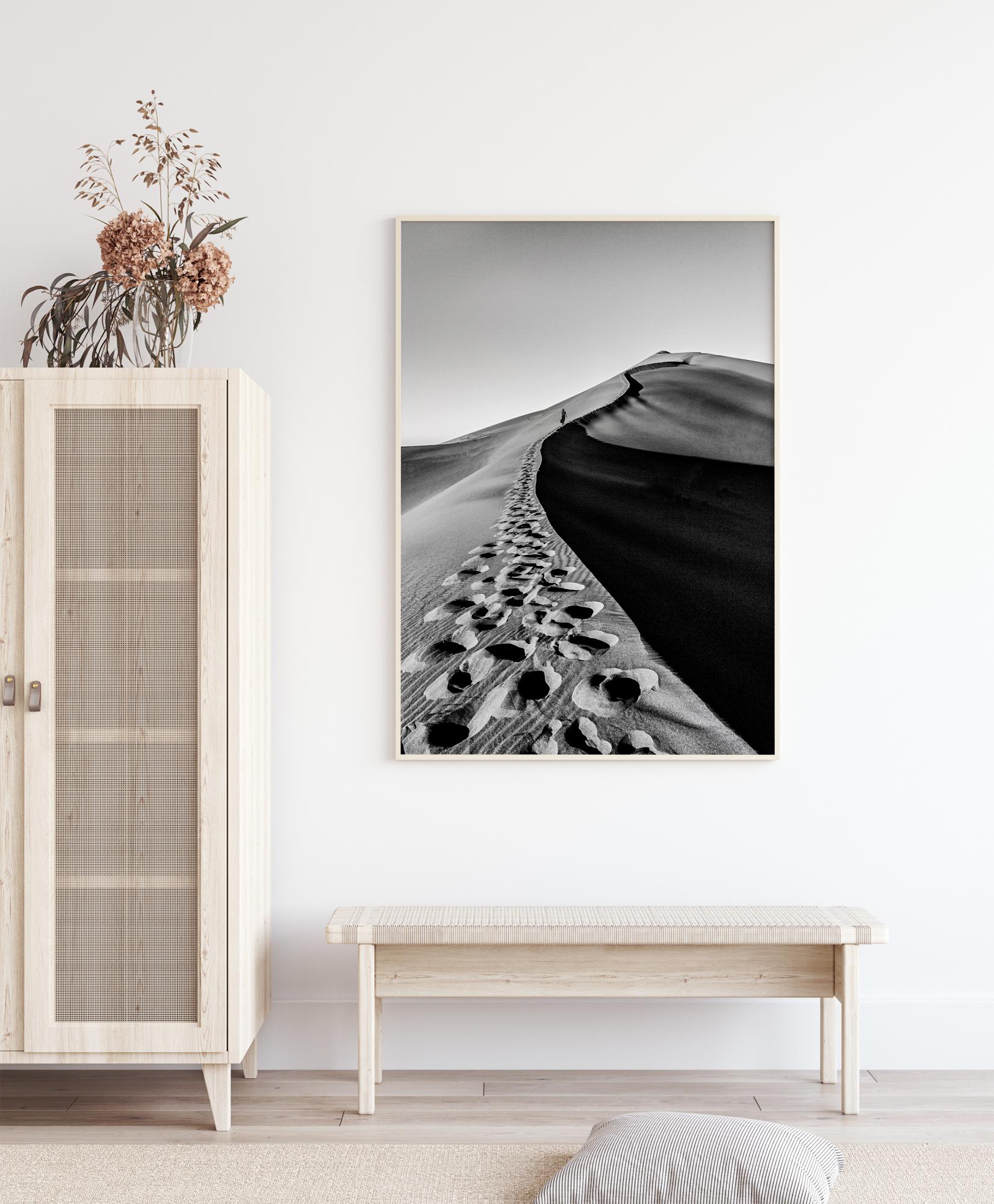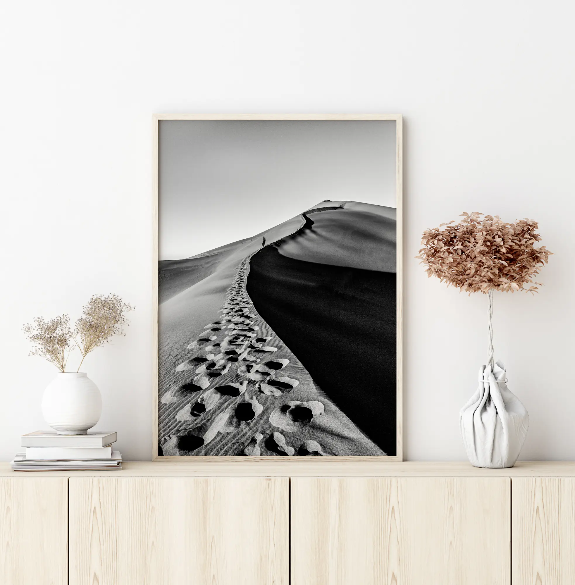 Imeline plakat inimesest, kes ronib üles liivaluide. Hämmastav must rada kontrasteerib liival olevate jalajälgedega, juhtides pilgu kaugemale figuurile. See pilt annab kodus seiklusliku tunde.