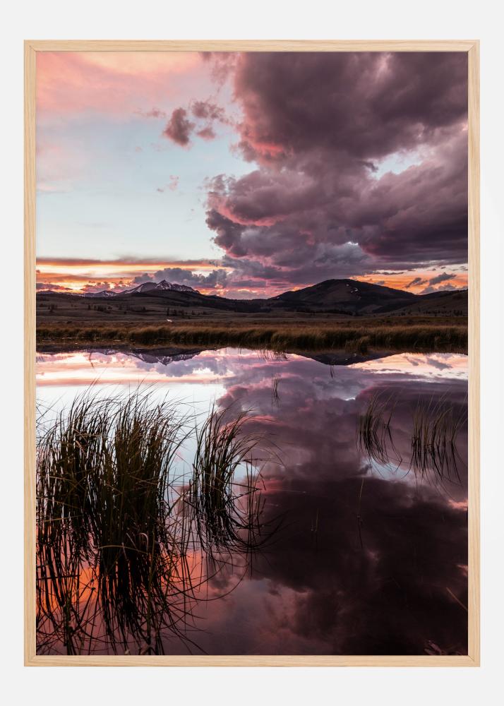Maastikuposter järve, pilliroogu ja fantastiliste pilvedega horisondi kohal. Pilliroog seisab järves ja kõigub tuules, samal ajal kui suured pilved rulluvad kohal ning peegelduvad veepinnal. Kaks pilverida juhivad pilku horisondi suunas ja punakata päikeseloojangut. Nautige draamat selles valitsevas pastelltoonitud teoses.