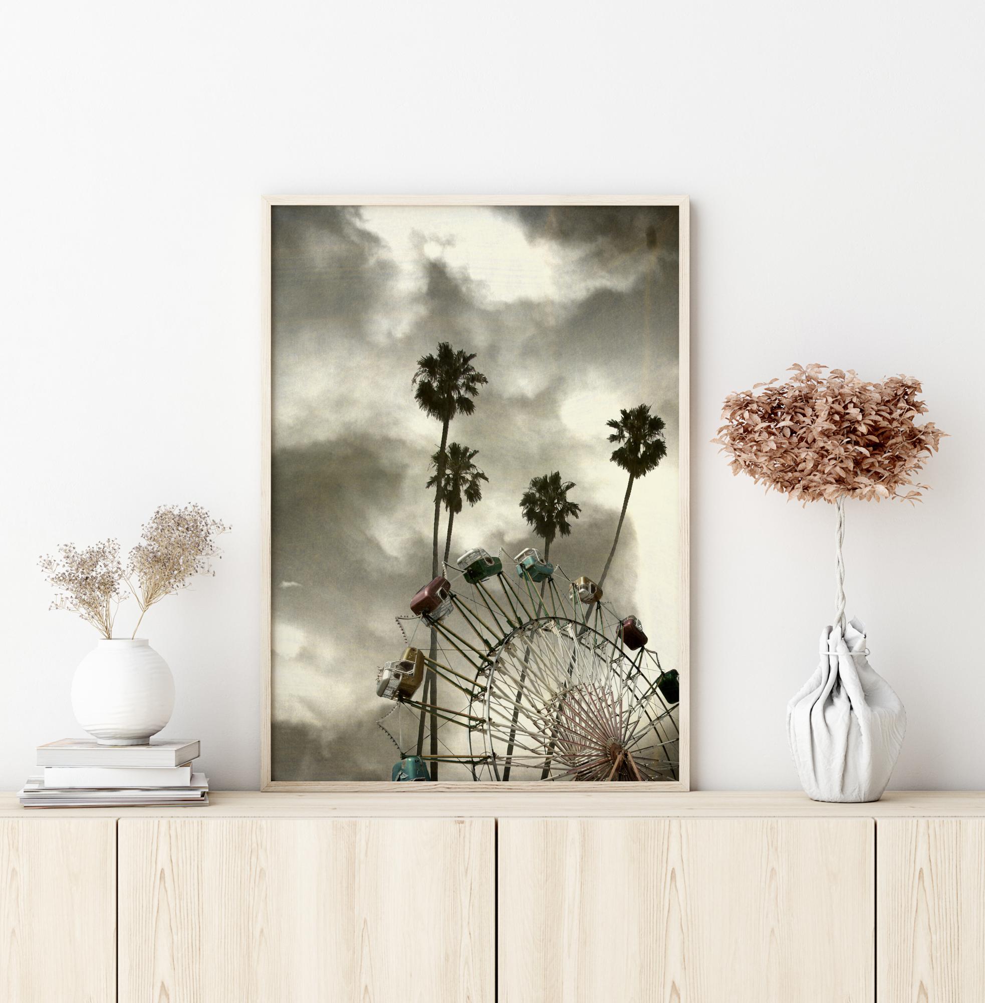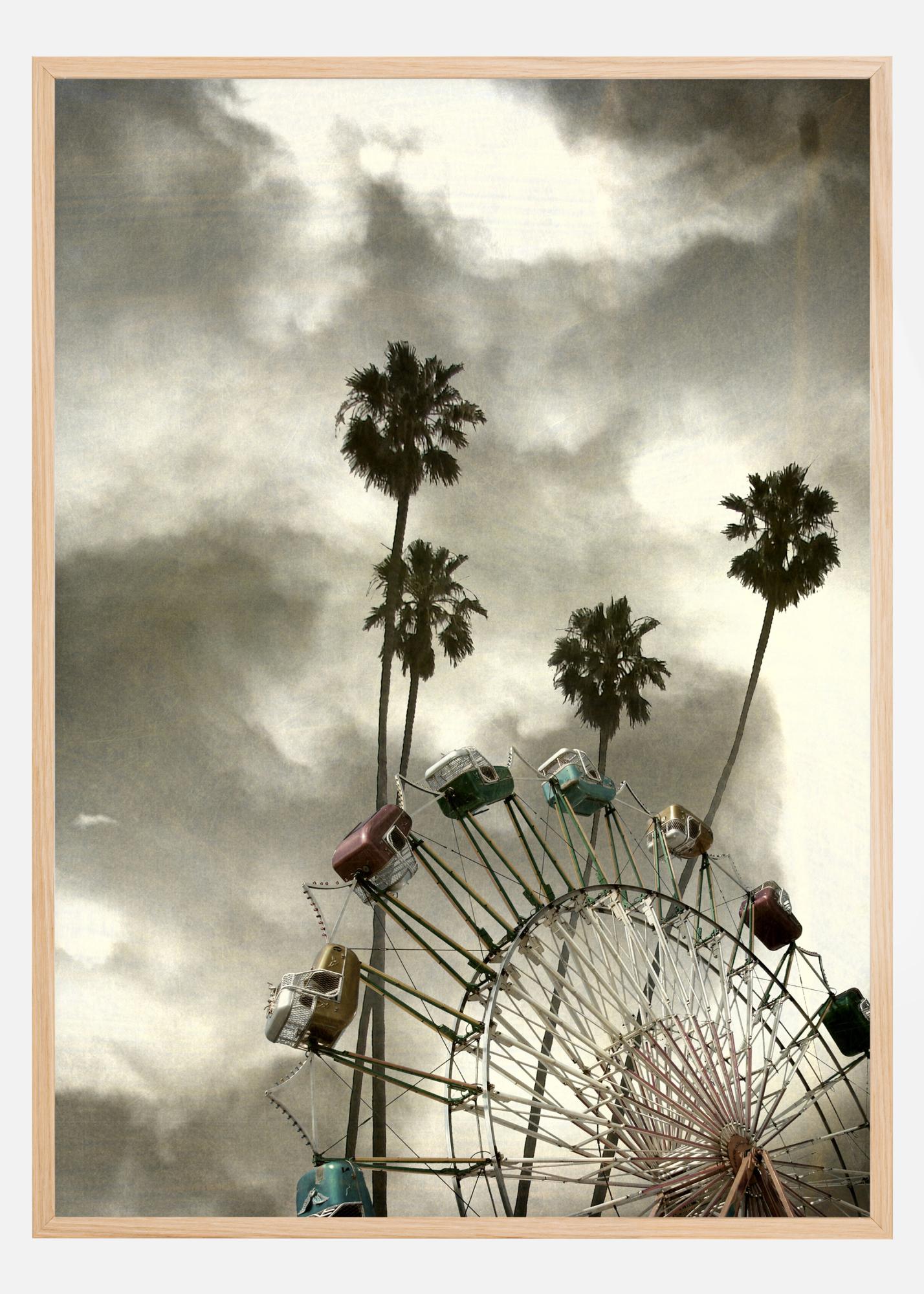 Fotograafiline plakat pargirataste sarnase karusselli kohta, mille vagunid on kaunites pastelsetes värvides, palmide ja dramaatilise taeva taustal. Ilus plakat, mis on täis emotsioone.