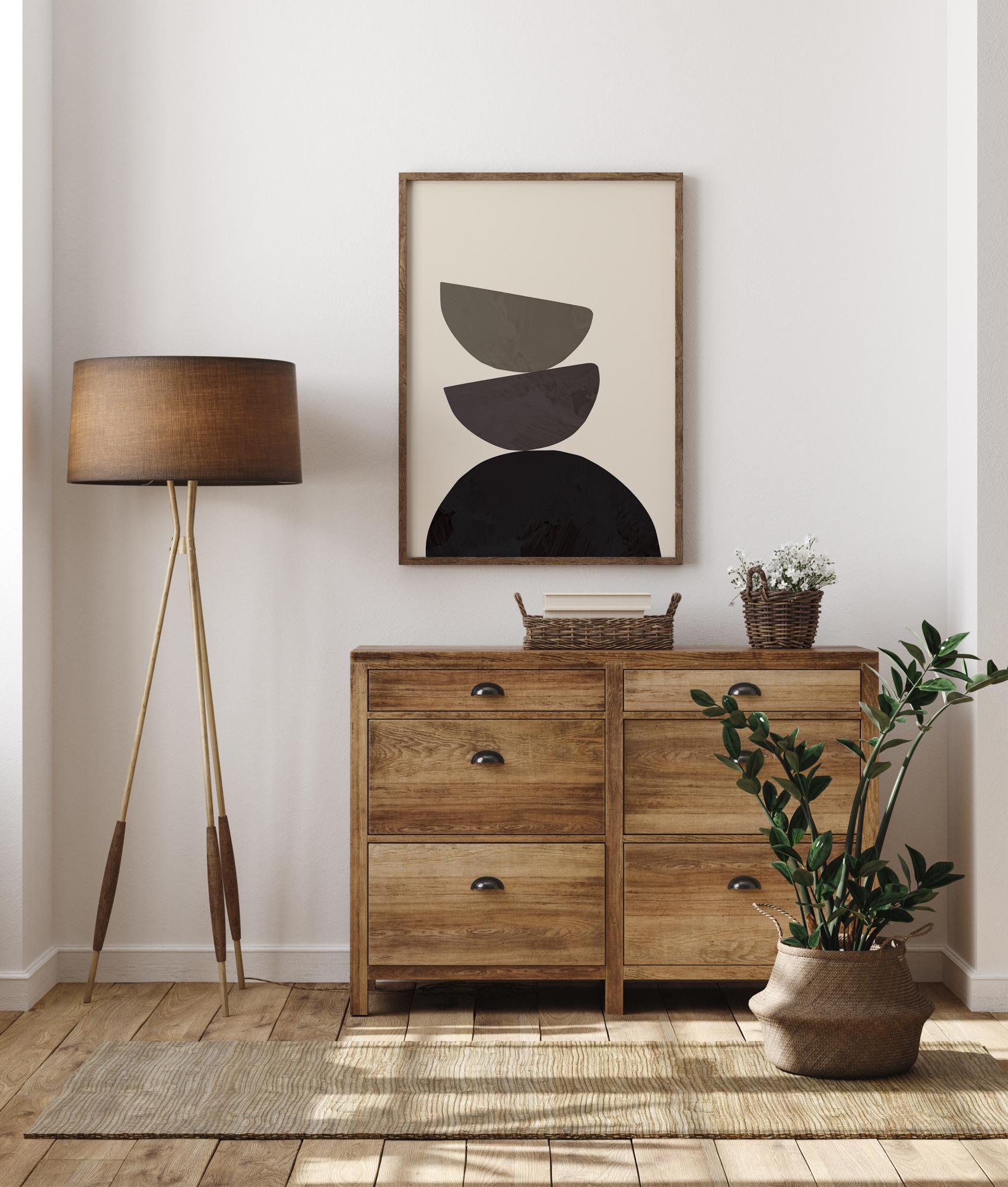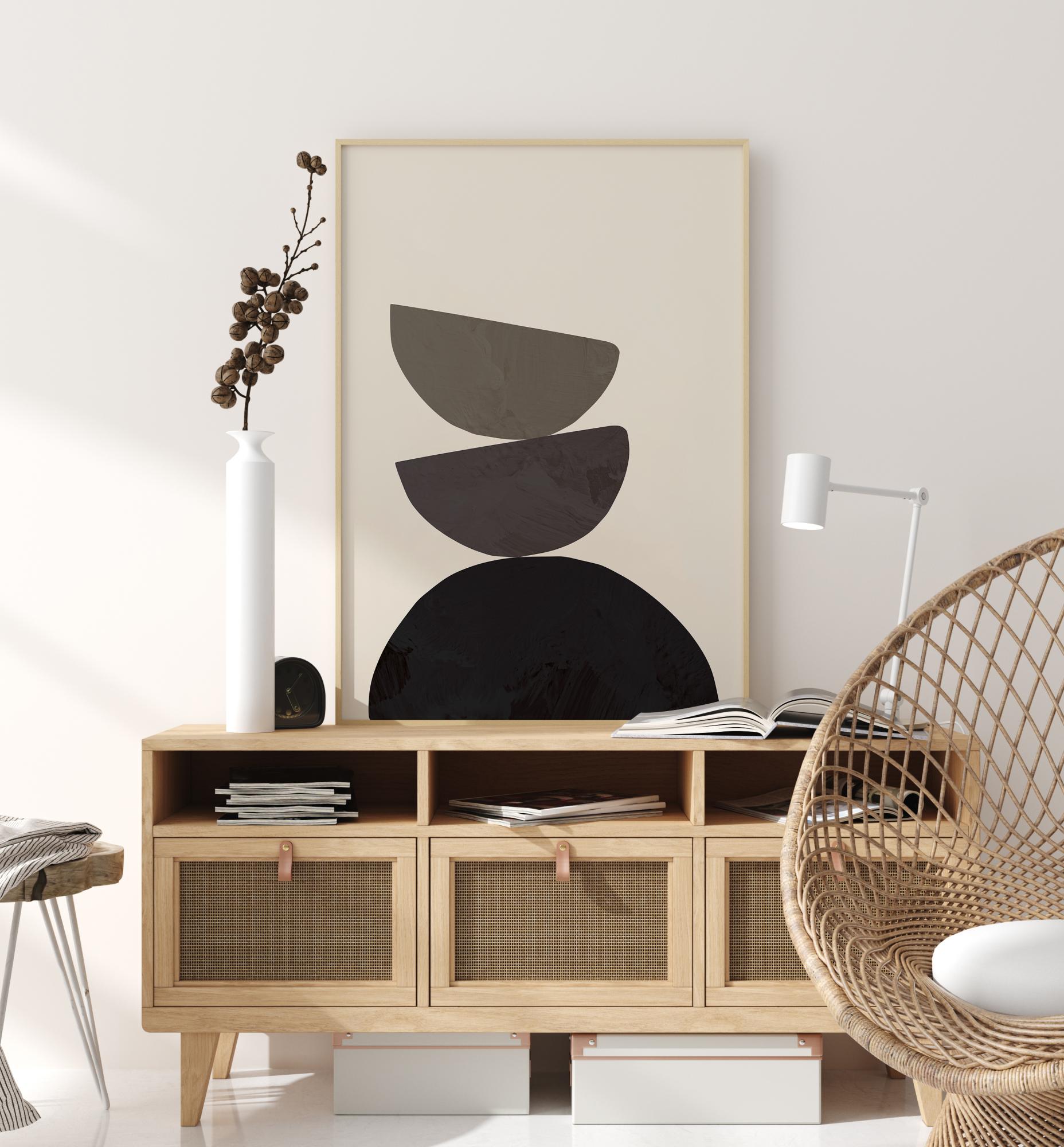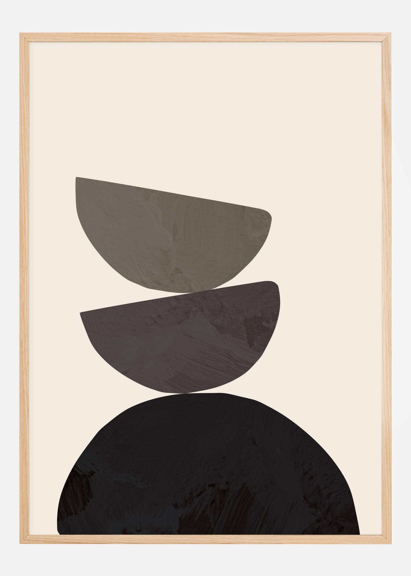Plakat kolme üksteise peale laotud poolringiga, mis tasakaalustavad üksteist. Alumisel pool on must poolring, mille kohal on kaks ülespoole suunatud poolringi erinevates hallides toonides. Naudi neid uskumatult tasakaalustatud kujundeid, kui riputad selle pildi heledad toonid seinale.