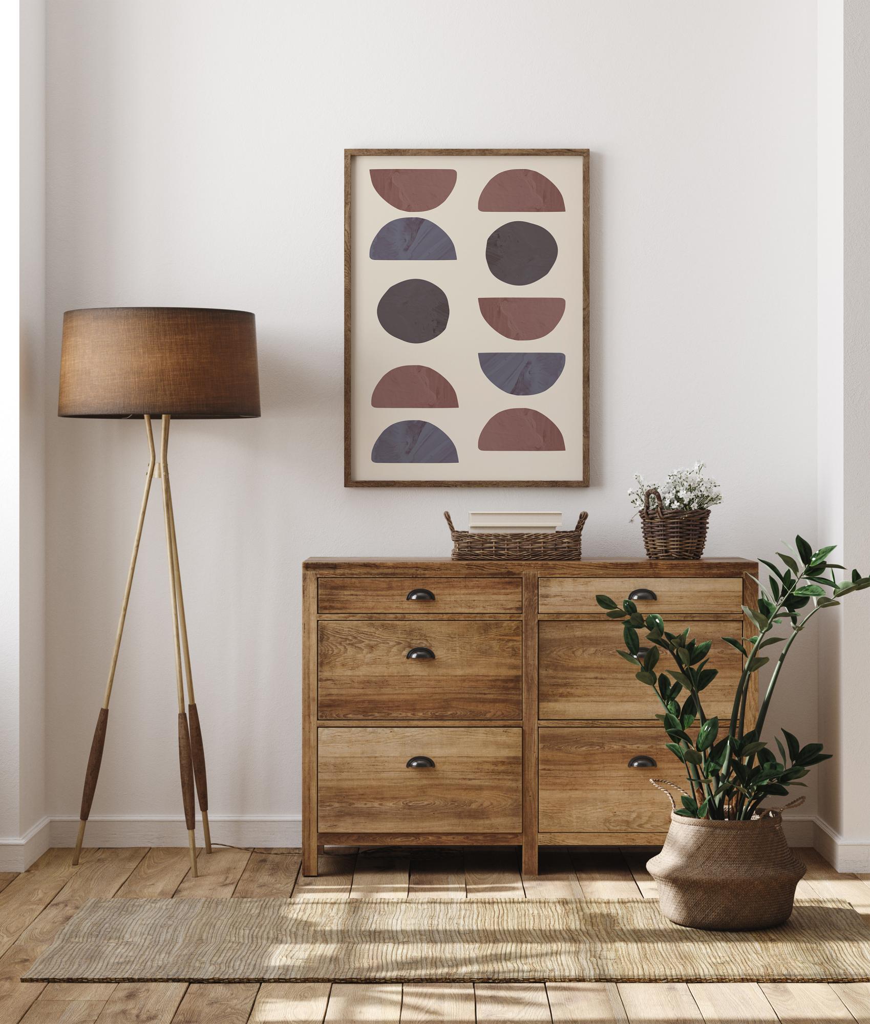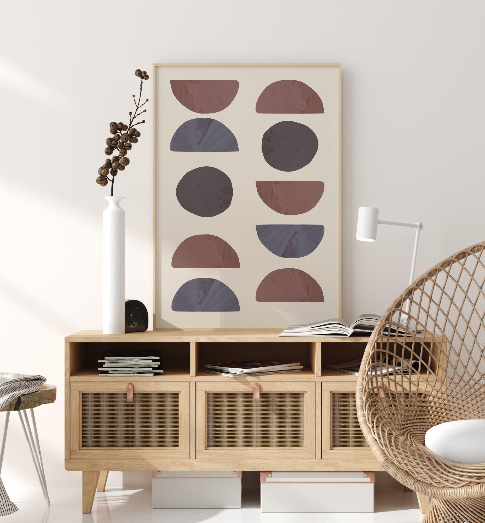 Abstraktne plakat, mis on täidetud erinevate poolringide ja ringikujuliste vormidega. Seal on kaks rida vorme, millel on erinevad mustrid ringide ja poolringidega, kõik erinevates sinise, halli ja punase toonides. Too majja elavust lihtsale seinale nende geomeetriliste vormidega.