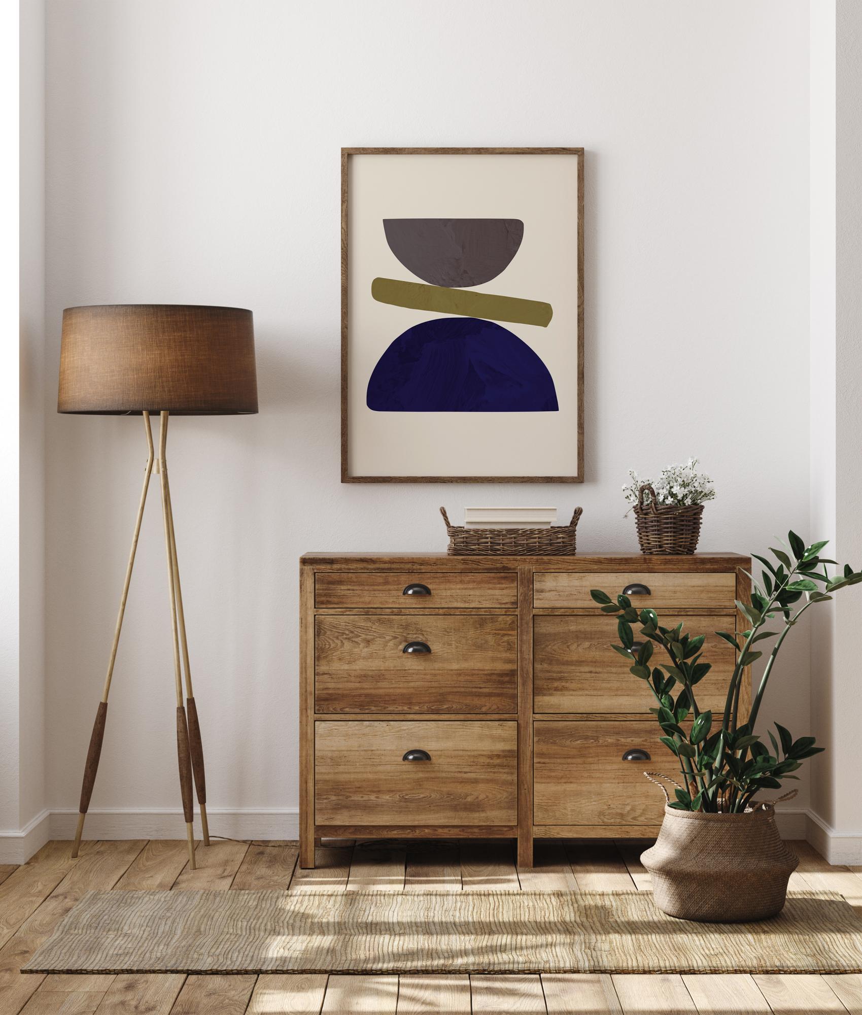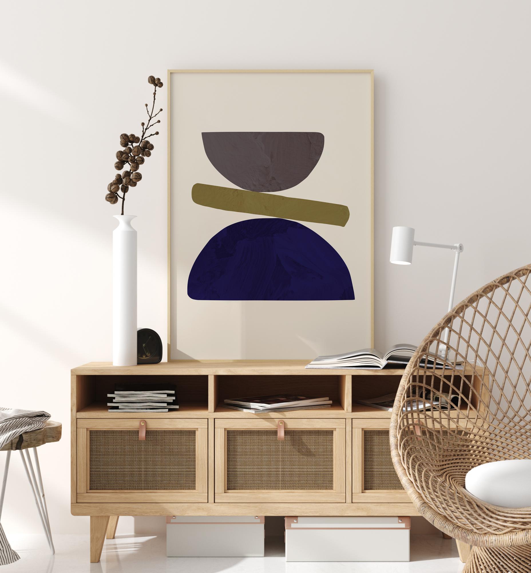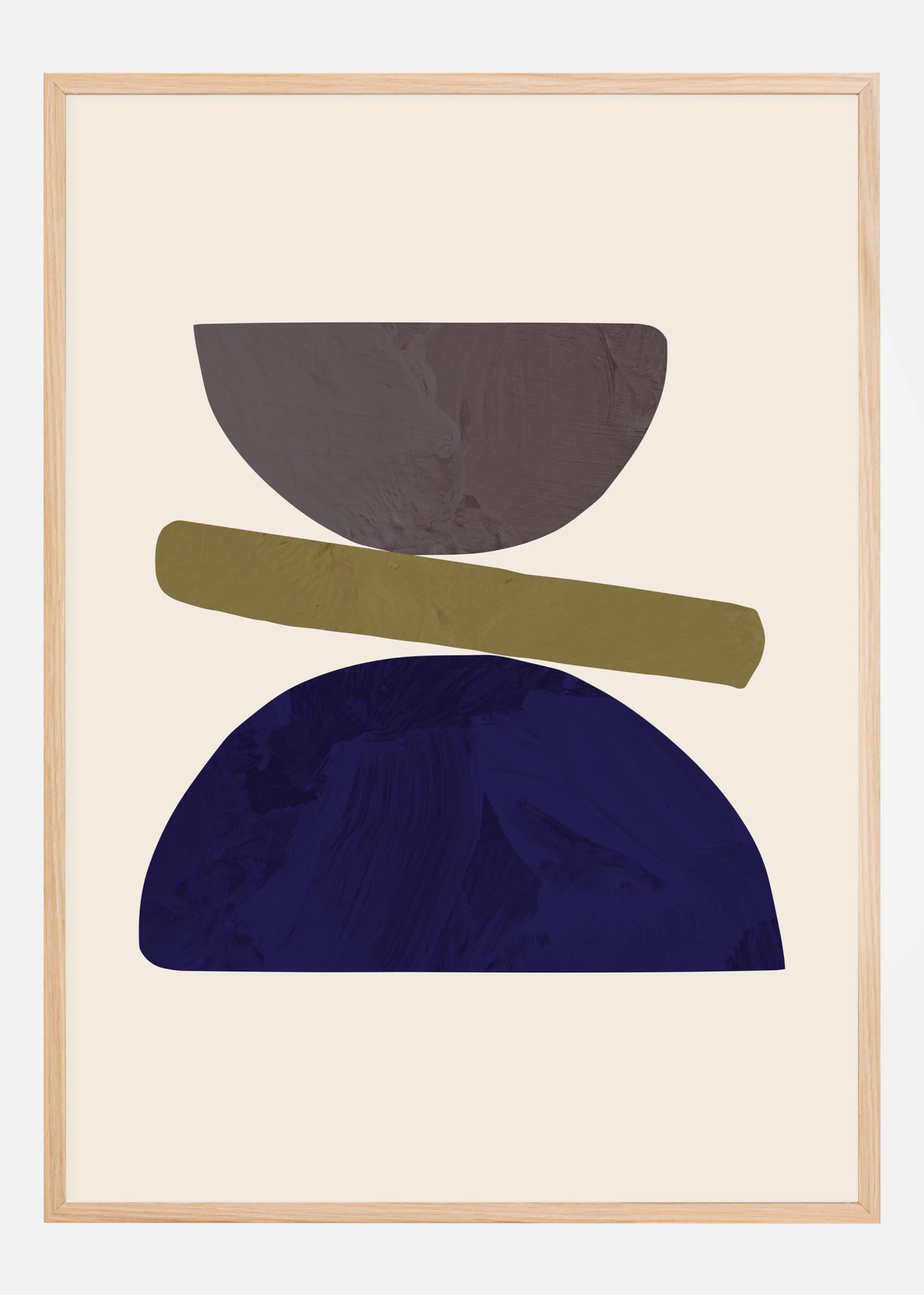 Plakat tasakaalu kohta geomeetria kaudu. Suur sinine poolring tasakaalustab oma kumerusel õhukest rohelist piklikku vormi. Lisaks moodustavad hallid poolringid liivakella kuju. Veeda tunde selle teose ees ja proovi leida teised vormid selles.