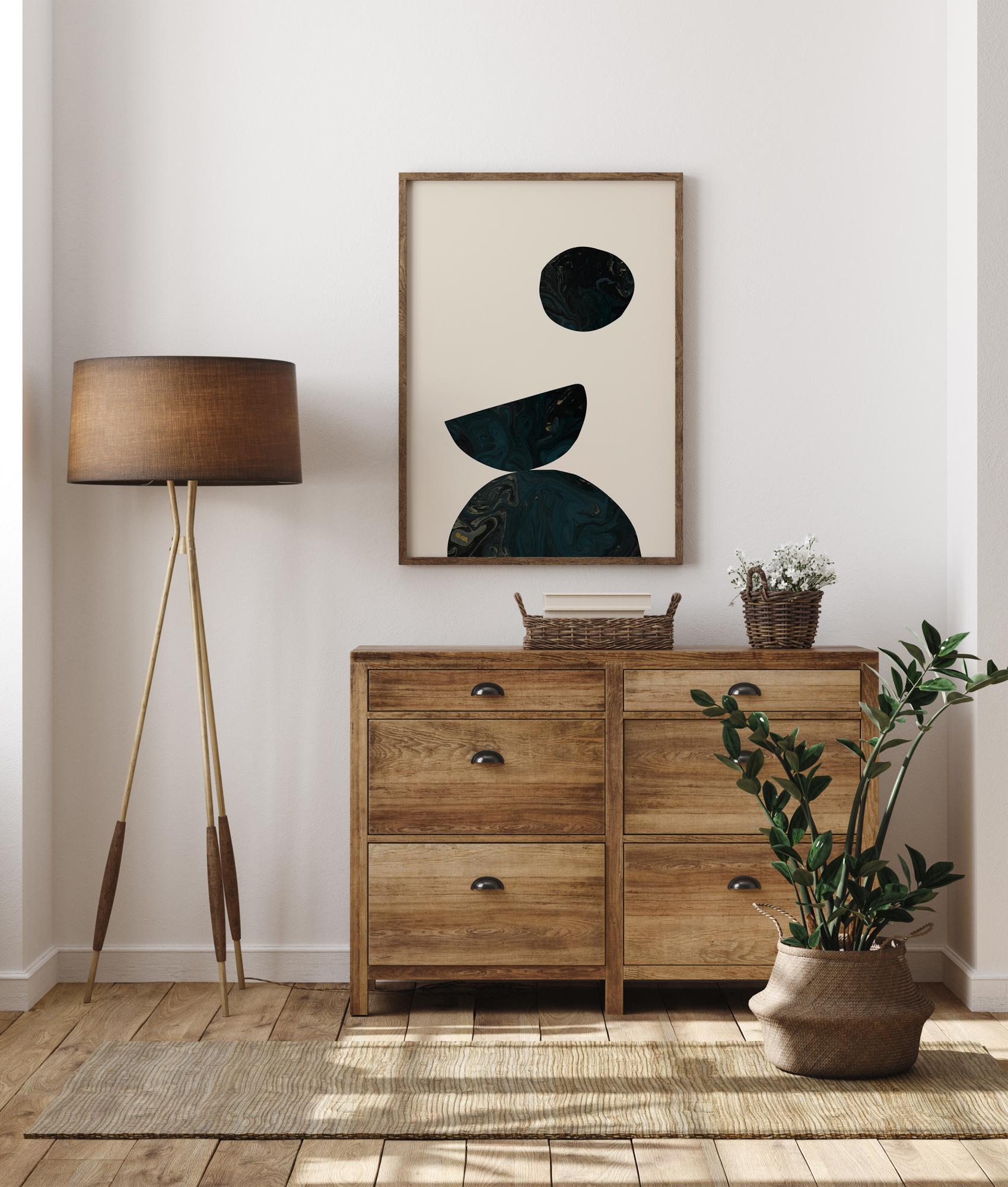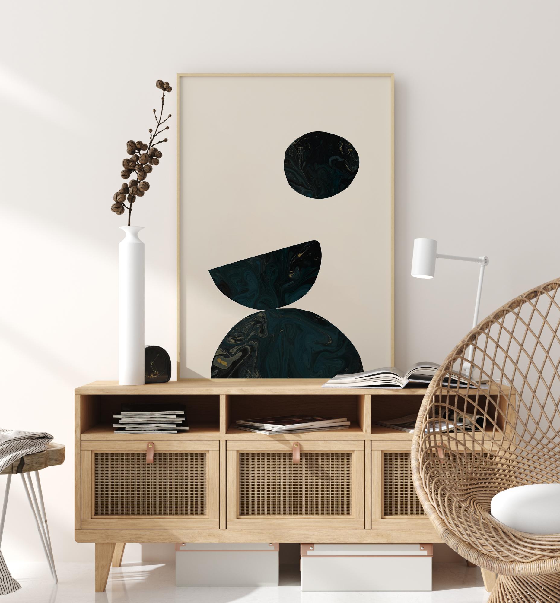 Hele plakat kolme tumesinise ja musta kujuga, mis loovad silmapaistva pildi. Poolring on asetatud allosas ja tasakaalustab teist ümberpööratud poolringi. Ülal hõljub must ring. Kõik on vastandlikul valgel taustal. Sobita need kaunid marmoriseeritud keerised seina kahvatumate toonidega, et lisada draamat.