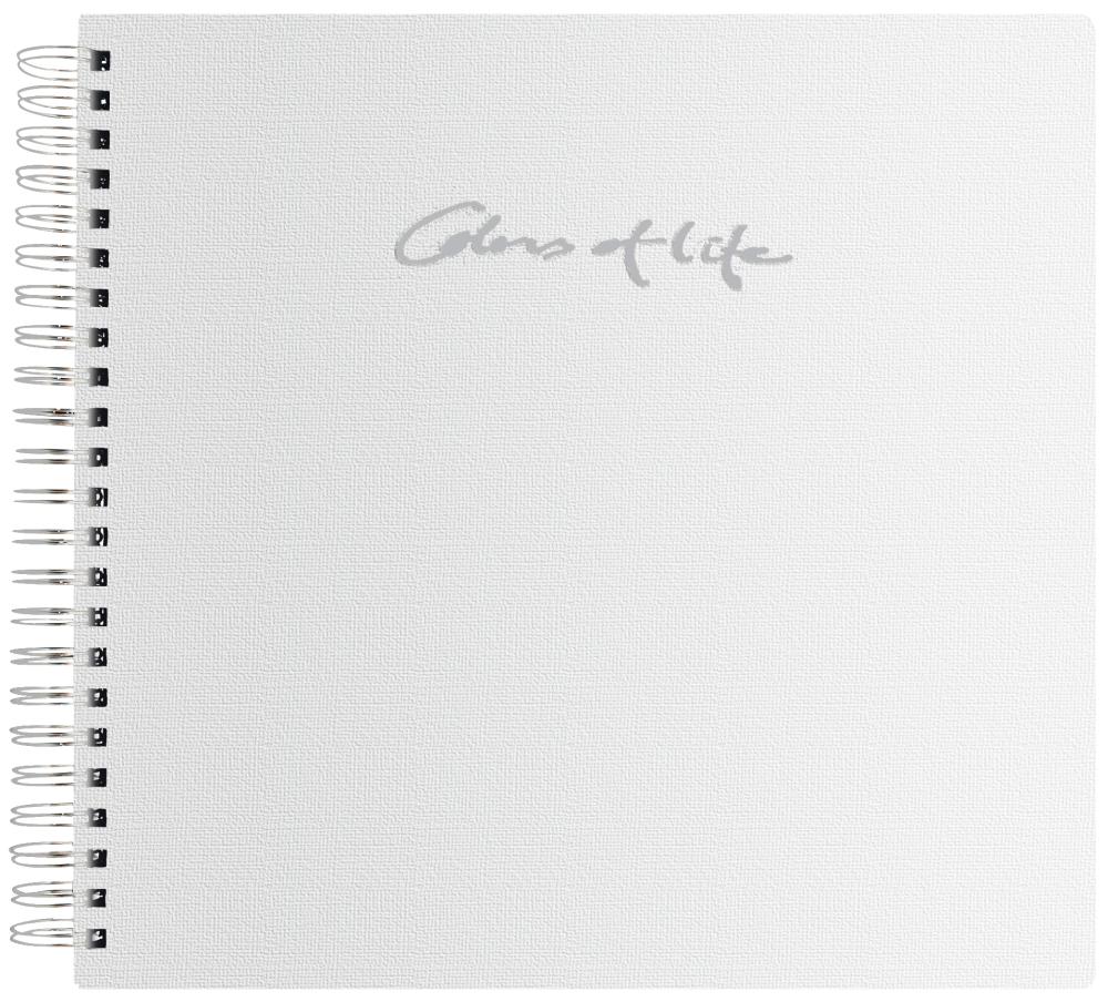 Spiraalalbum mõõtmetega 30x30 cm, 24 hapeteta valget lehte, valmis mälestustega täitmiseks! Albumi esiküljel on tekst "Colors of life" hõbedaselt.