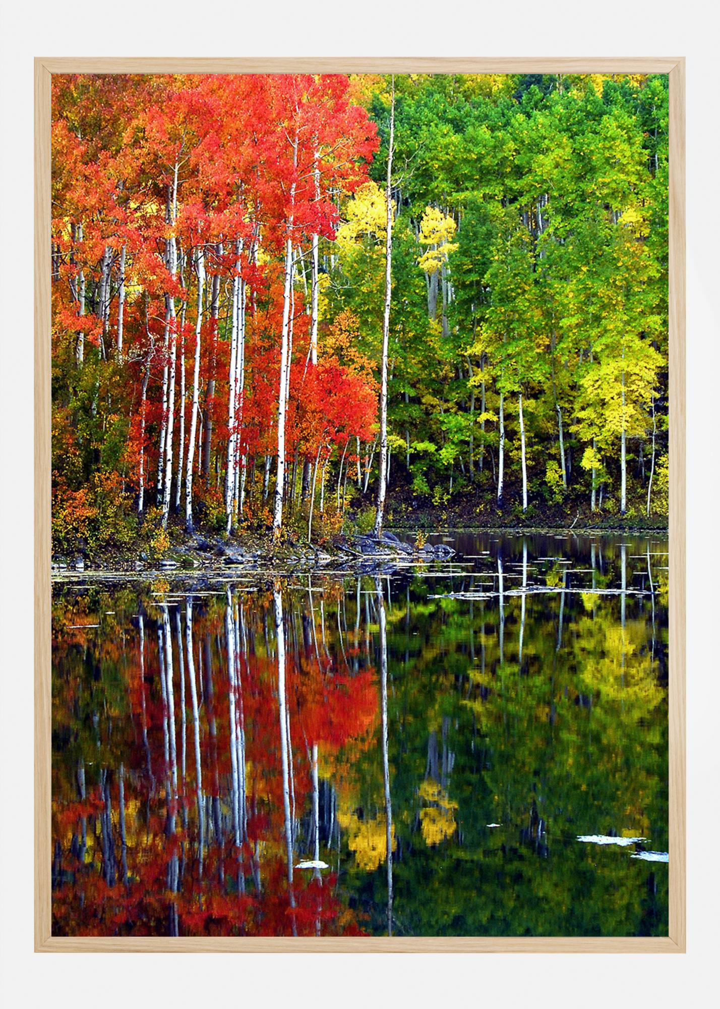 Helge plakat järvega, mida ümbritsevad puud. Kevad ja sügis kohtuvad selles värvikas pildis, kus vasakul on punased lehed ja paremal rohelised. Kõik heidavad heleda peegelduse järve vette rahulikus, kuid siiski värvikas stseenis. Too looduse rõõm oma koju selle väljatrüki abil.