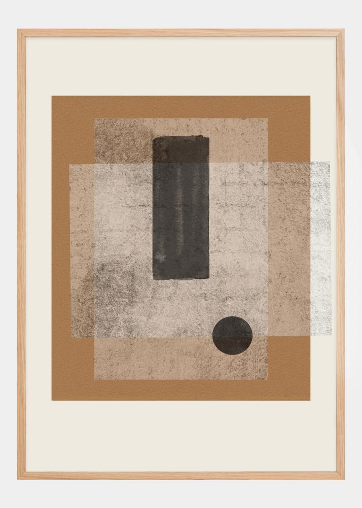 See plakat on austusavaldus abstraktse kunsti meistritele, kelle teosed mängisid vormi ja tekstuuriga, et luua tasakaalu ja sügavust. Pruuni, musta ja halli toonides kattuvad ristkülikud loovad ruumi ja mõõtme tunde, samal ajal kui üksik ring lisab kompositsioonile peene, kuid võimsa dünaamika.