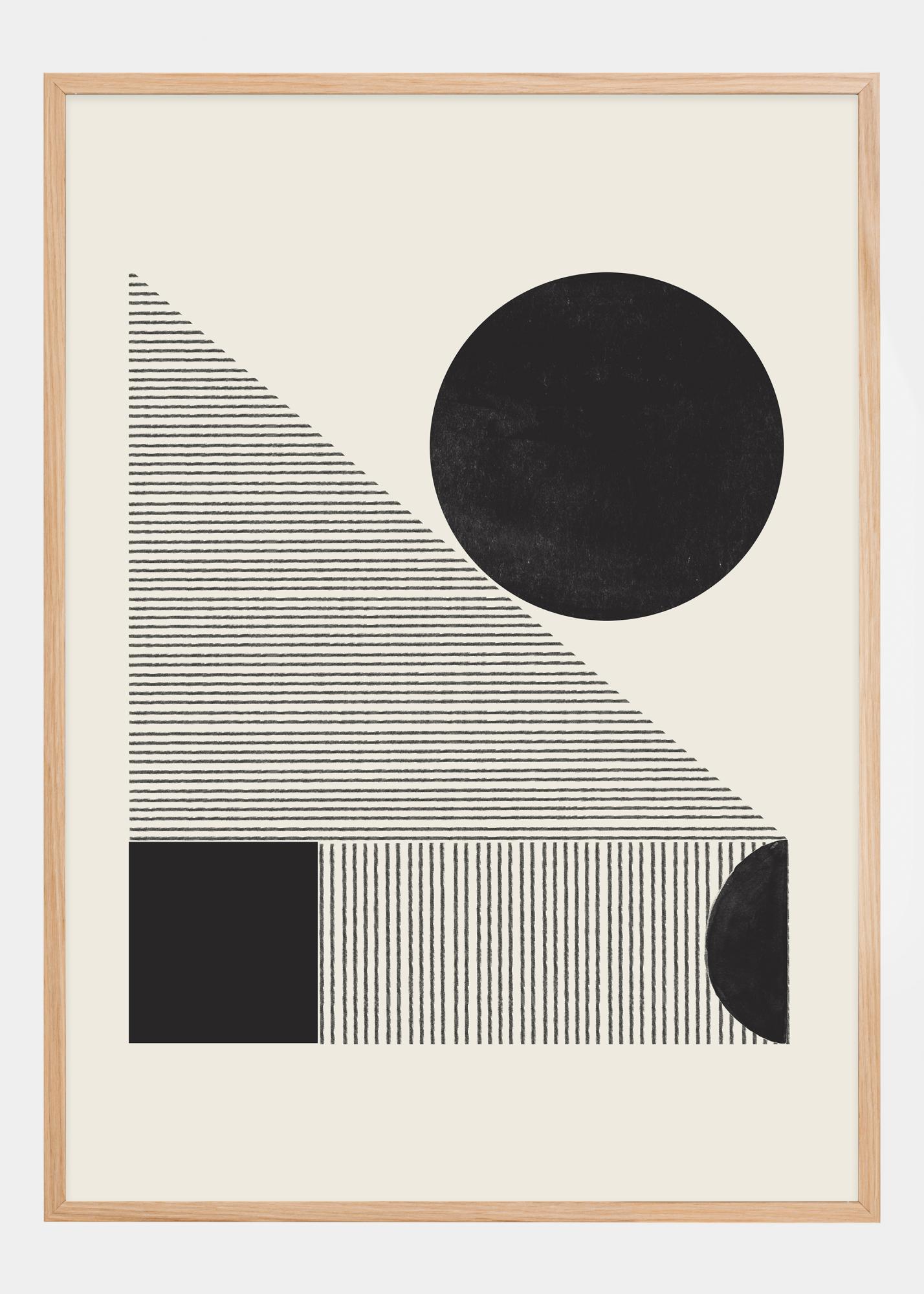 See plakat on mänguline ja rafineeritud tõlgendus geomeetrilisest abstraktsioonist. Mustad ja valged jooned mängivad koos hoolikalt tasakaalustatud kujundite mustriga, samas kui suur must ring domineerib kompositsiooni ülemist osa ja loob tugeva visuaalse ankrukoha. Kontrastne mäng täidlastel mustadel aladel ja valgetel joontel kutsub vaatajat uurima pildi erinevaid tekstuure ja sügavusi.