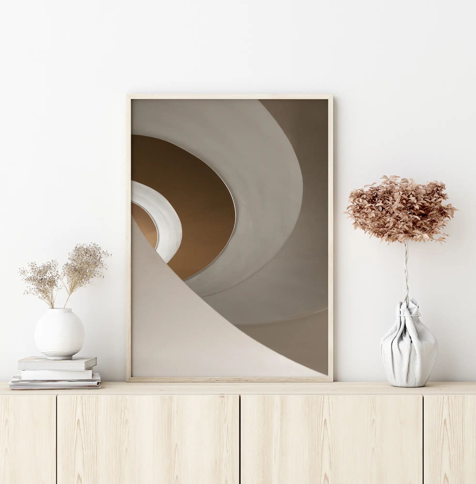 Keerlev plakat valge ja pruuni betoonist keerdtrepiga. Jälgi samme, kui need pildil vasakule keeravad. Pilk järgneb trepile, kuni spiraal kaob. Parima efekti saavutamiseks sobita õrnalt sinise seinaga.