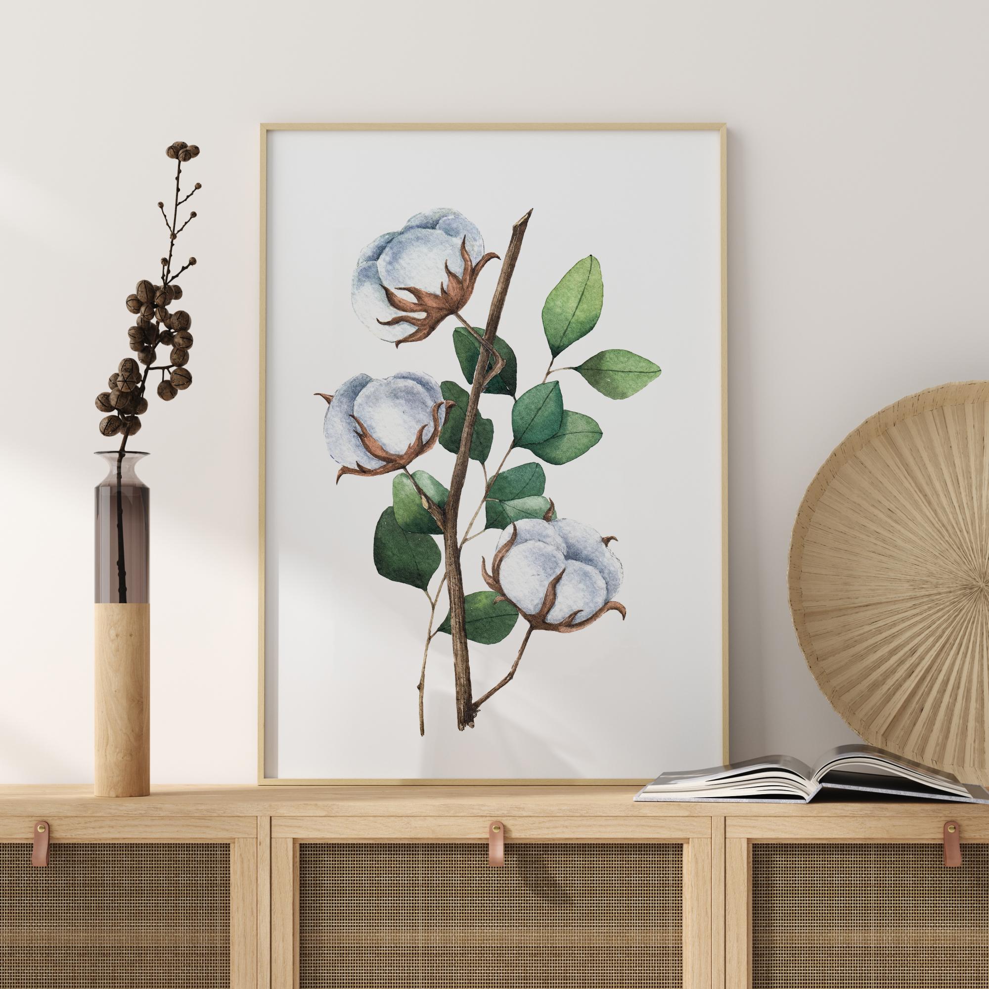 Illustratiivne plakat ühe puuvillalilleõiega. See kunstiline botaaniline illustratsioon toob ettevaatlikult esile suure puuvillapea puhtal valgel taustal. Riputa see pilt kodus üles ja tunne end tärkava botaanikuna.