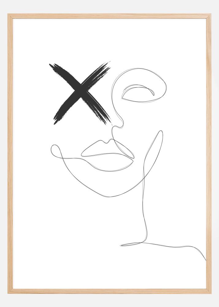 Abstrakt plakat näoga, mis on joonistatud õhukese musta joonega valgel taustal. Joon on ühendatud voolava liigutusega näo joonistamiseks. Üle ühe silma on joonistatud suur must rist. Riputage see värvilisele seinale, et tekitada huvitavat jututeemat.