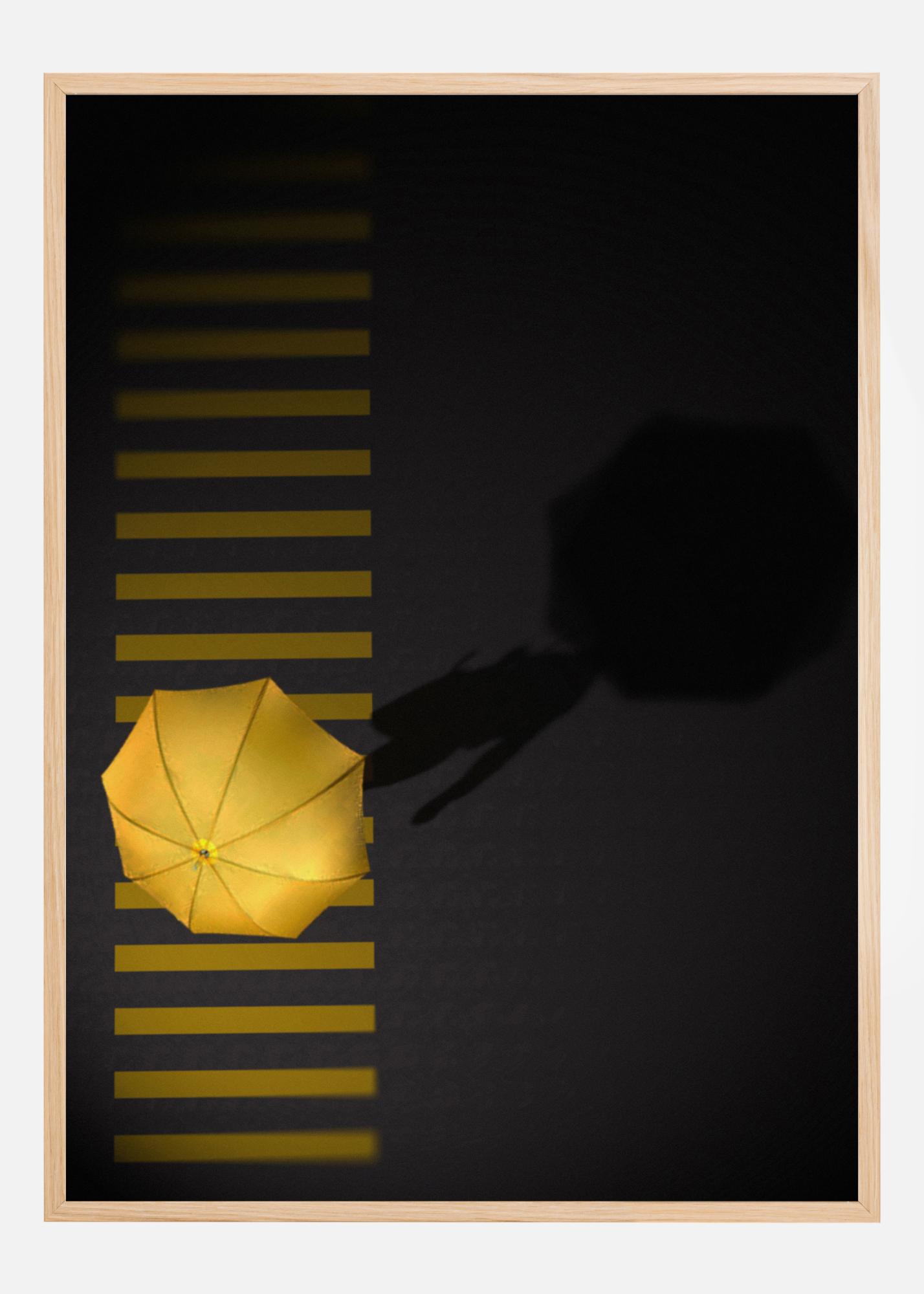 Õhufoto jalakäijast kollase vihmavarjuga ülekäigurajal. Ülekäiguraja helekollased jooned jagunevad värvilise kollase vihmavarju järgi. Jalakäija vari lisab pildile ekstra draamat ja muudab teose täiuslikuks sisustuselemendiks.