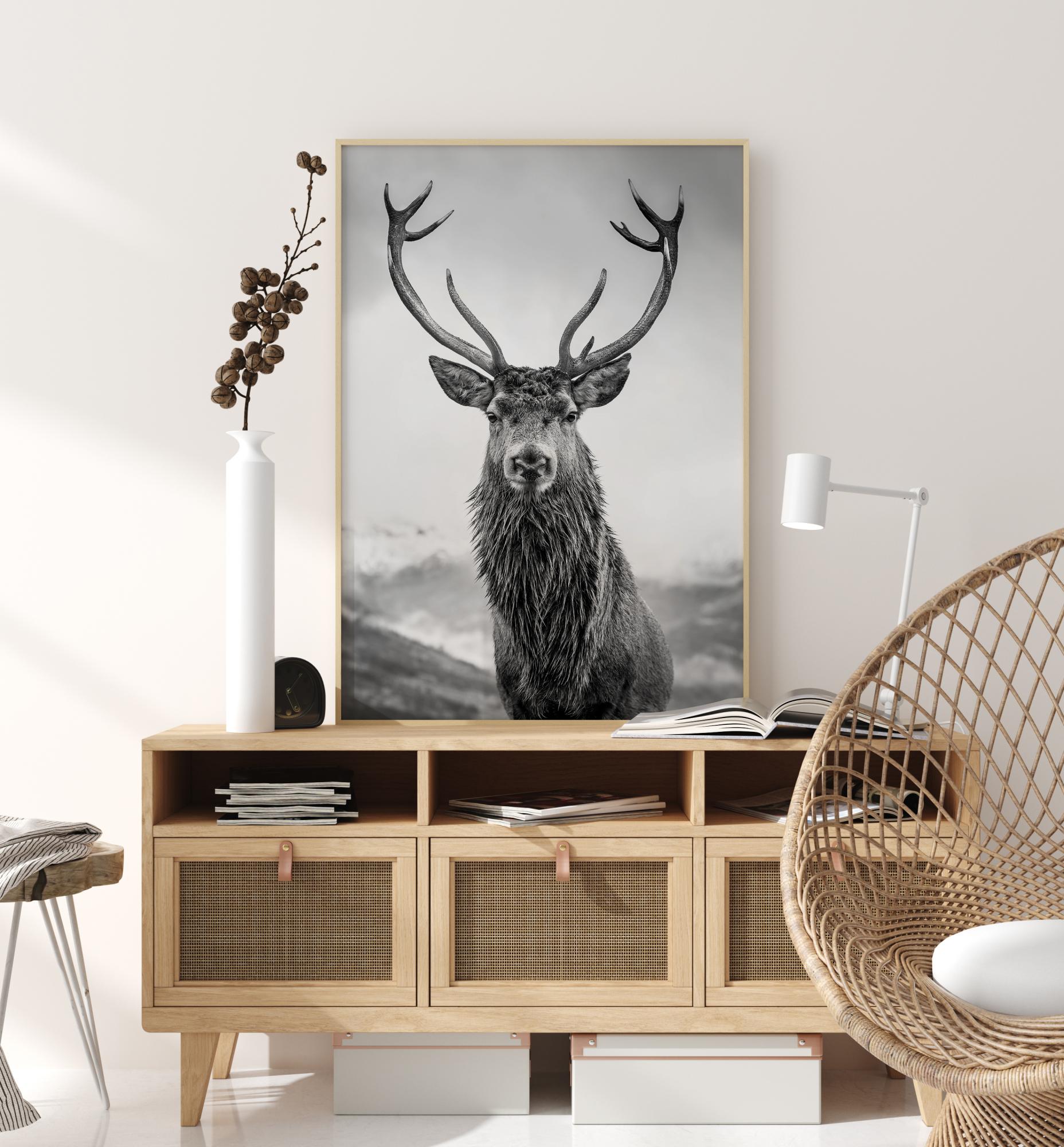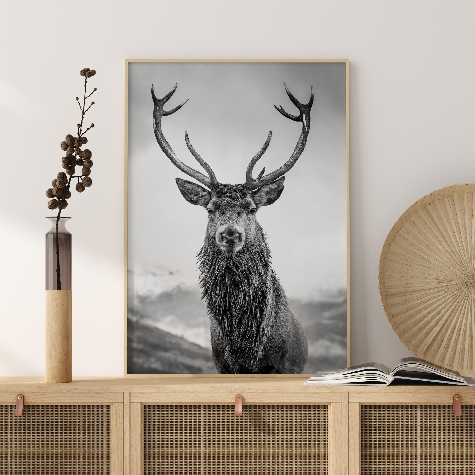 Kuninglik plakat punase hirvega. Uudishimulik hirv vaatab otse kaamerasse, tema sarved dramatiliselt hargnedes pilvisesse taevasse. Taustal on lainetavad künkad. See mustvalge trükk tõmbab tõeliselt tähelepanu rohelisel või sinisel seinal.