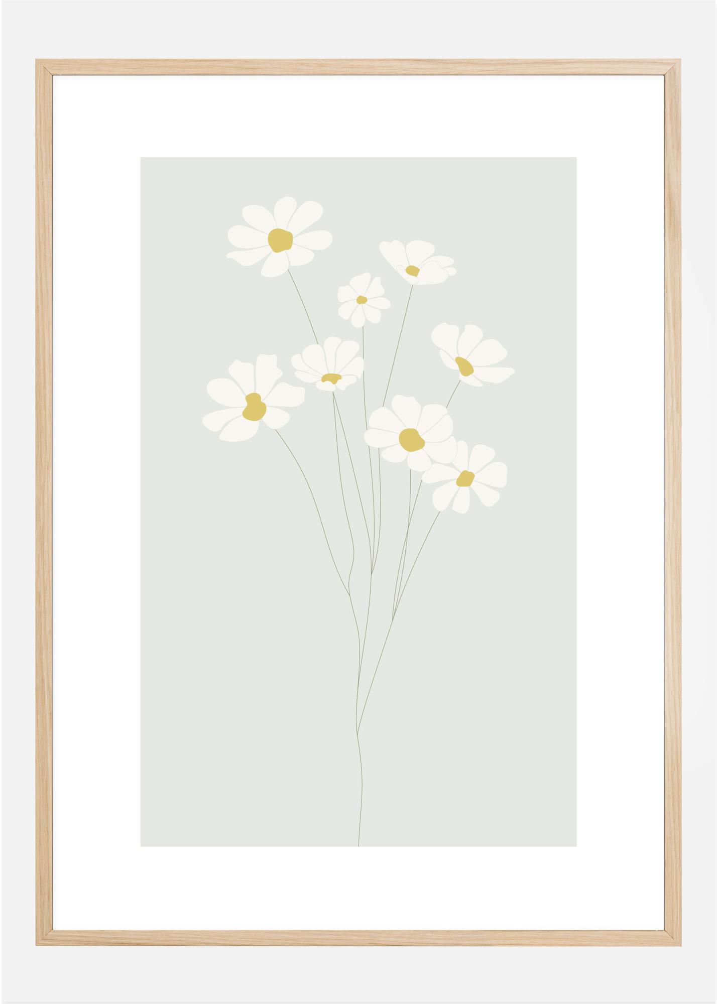 Peen poster, millel on trükk õrnade väljanägemisega karikakrast. Lihtsad valged ja kollased lilled sirutuvad ülespoole õrnadel vartel pehme helesinise tausta poole. Riputage see pilt oma lapse magamistuppa rahustava, kuid armsa atmosfääri loomiseks.