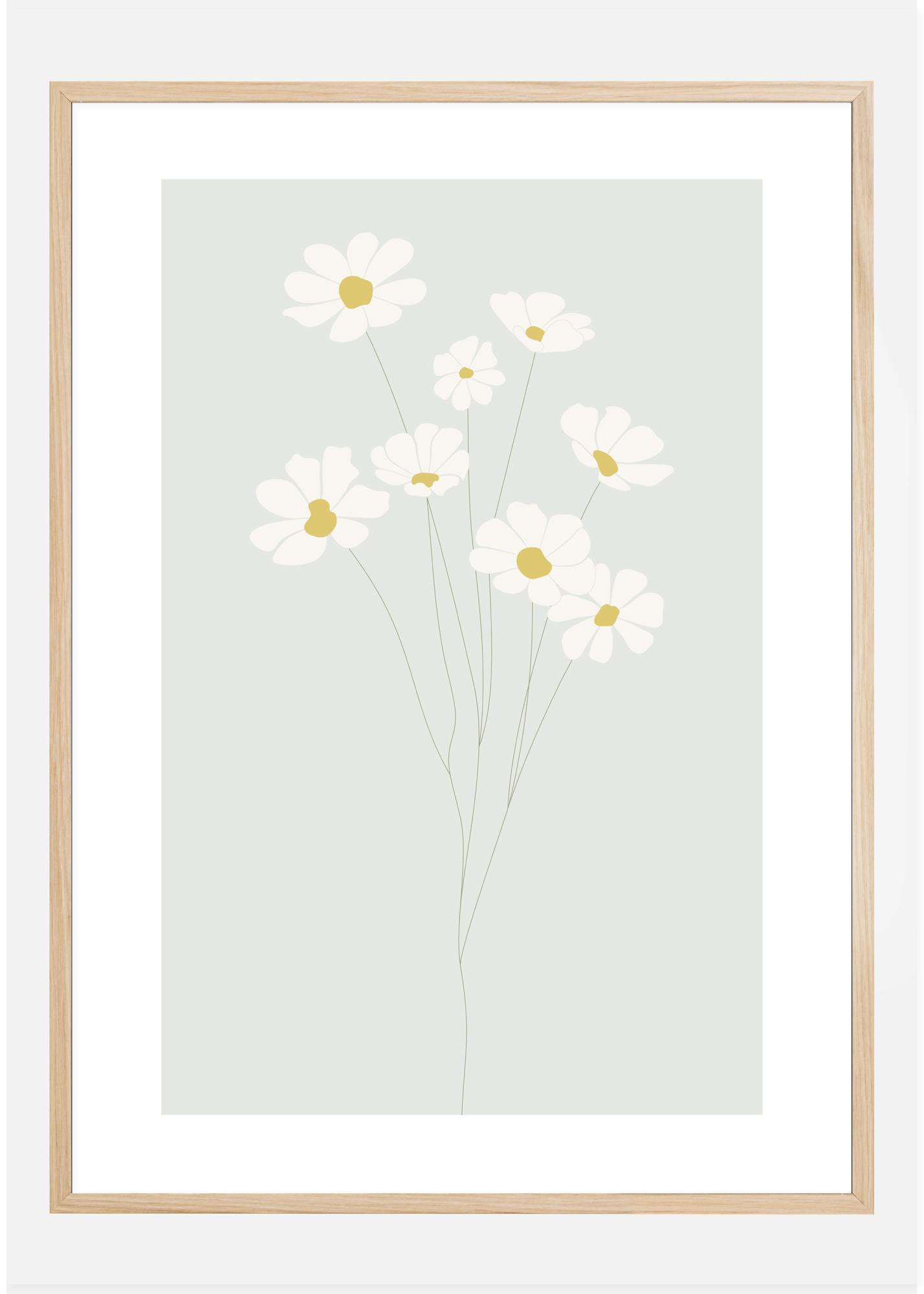 Subtiilne plakat koos trükisega, millel on õrna väljanägemisega karikakar. Lihtsad valged ja kollased lilled ulatuvad üles peenikestel vartel pehme kahvatusinise tausta poole. Riputage see pilt oma lapse magamistuppa rahustava, kuid armsa atmosfääri jaoks.