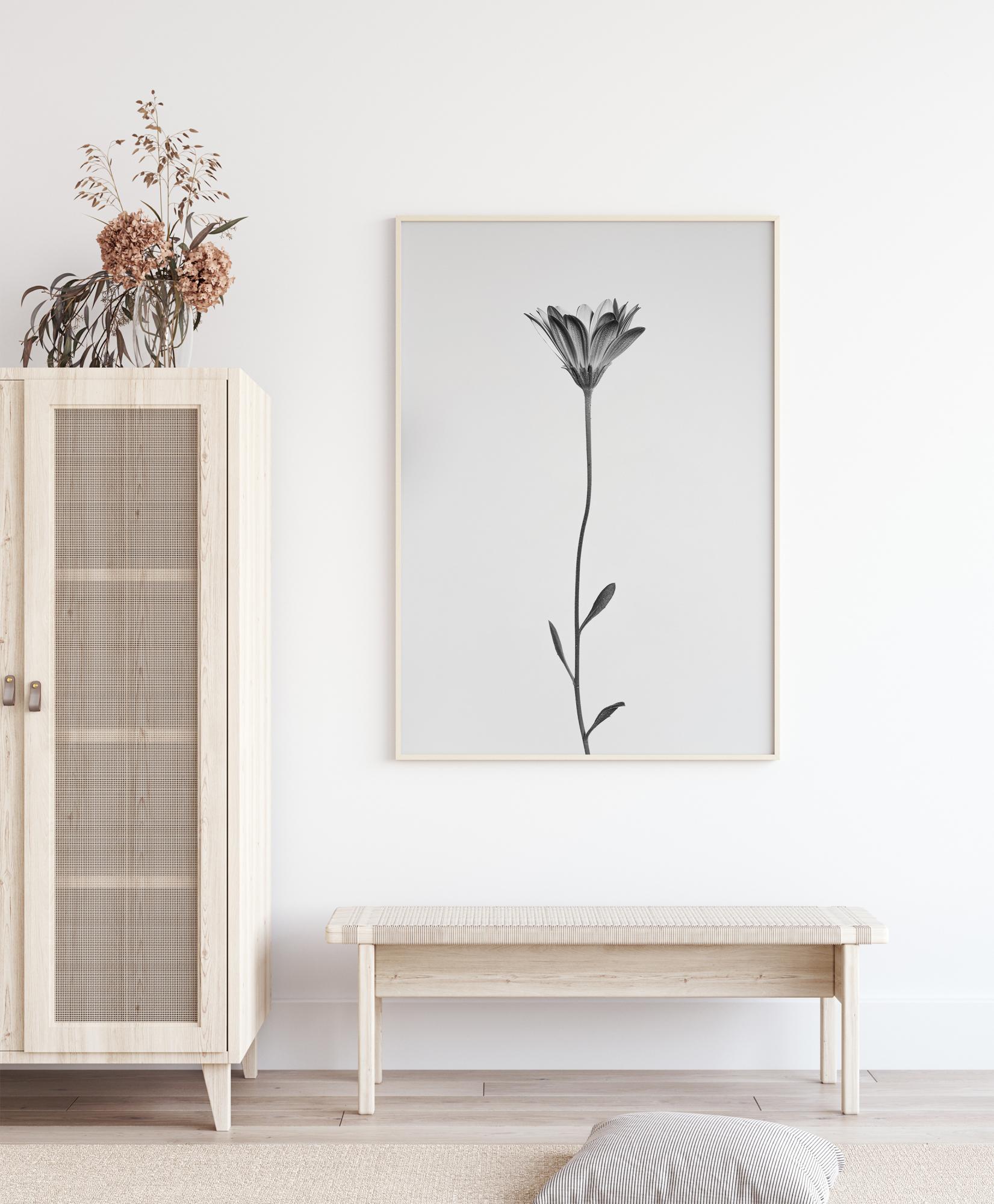 Plakat lähedalt pika karikakra kujutisega puhtal valgel taustal. Lille lihtne elegants on täiuslik täiendus teie minimalistlikule vannitoale või köögile.