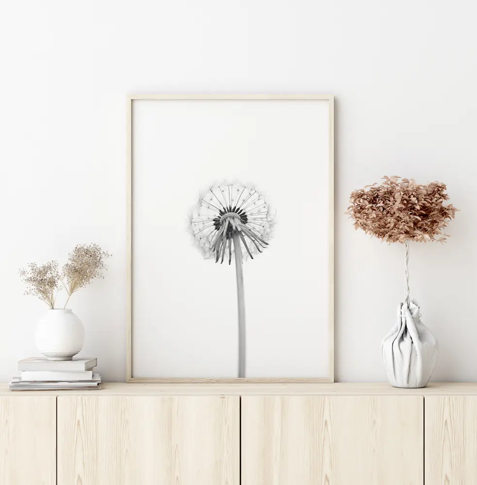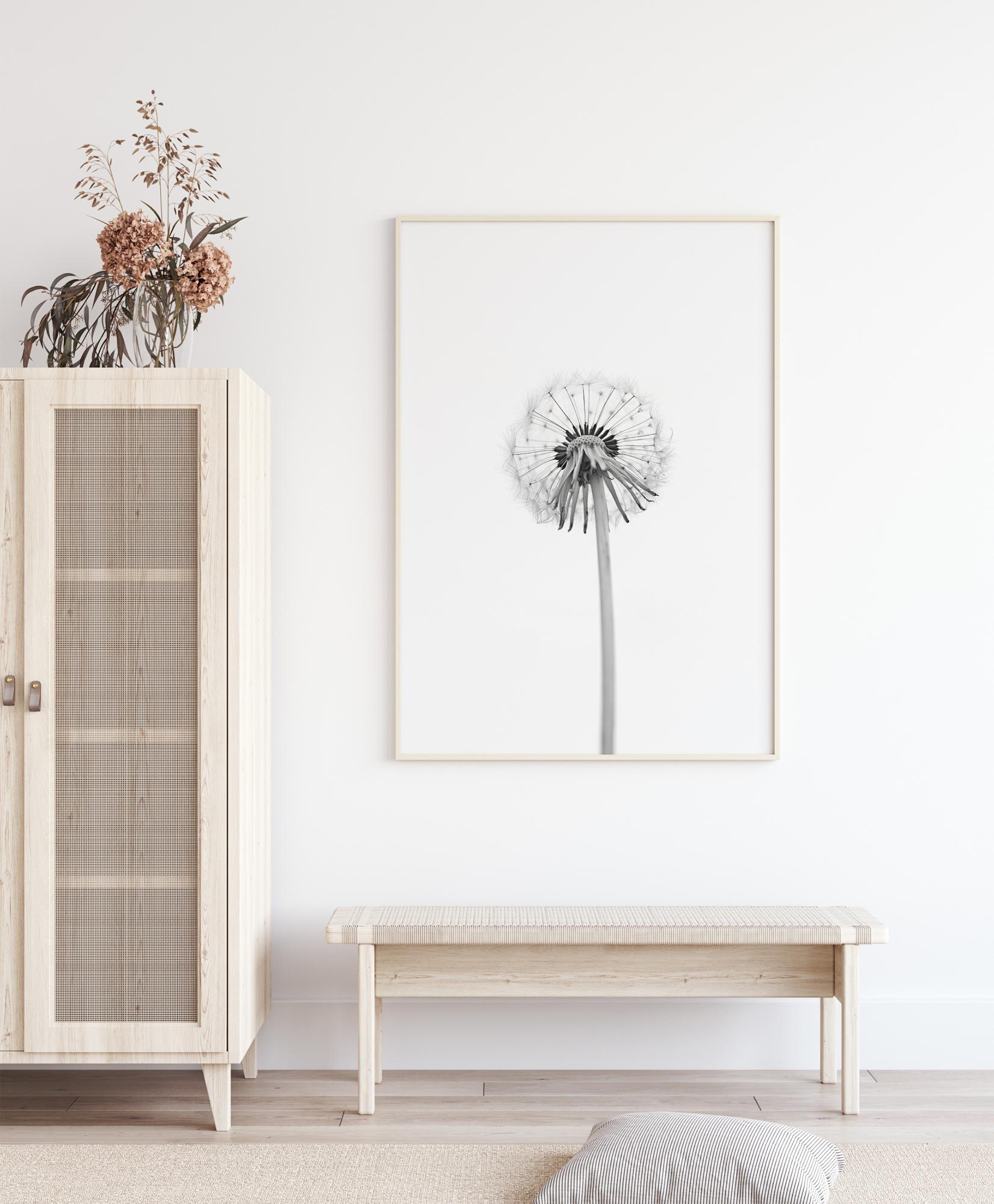 Hele, puhas loodusplakat võilillega valgel taustal. See peamiselt valge pilt paistab silma elavalt sinise või rohelise seina taustal. See pilt sobib ideaalselt galeriiseinale.