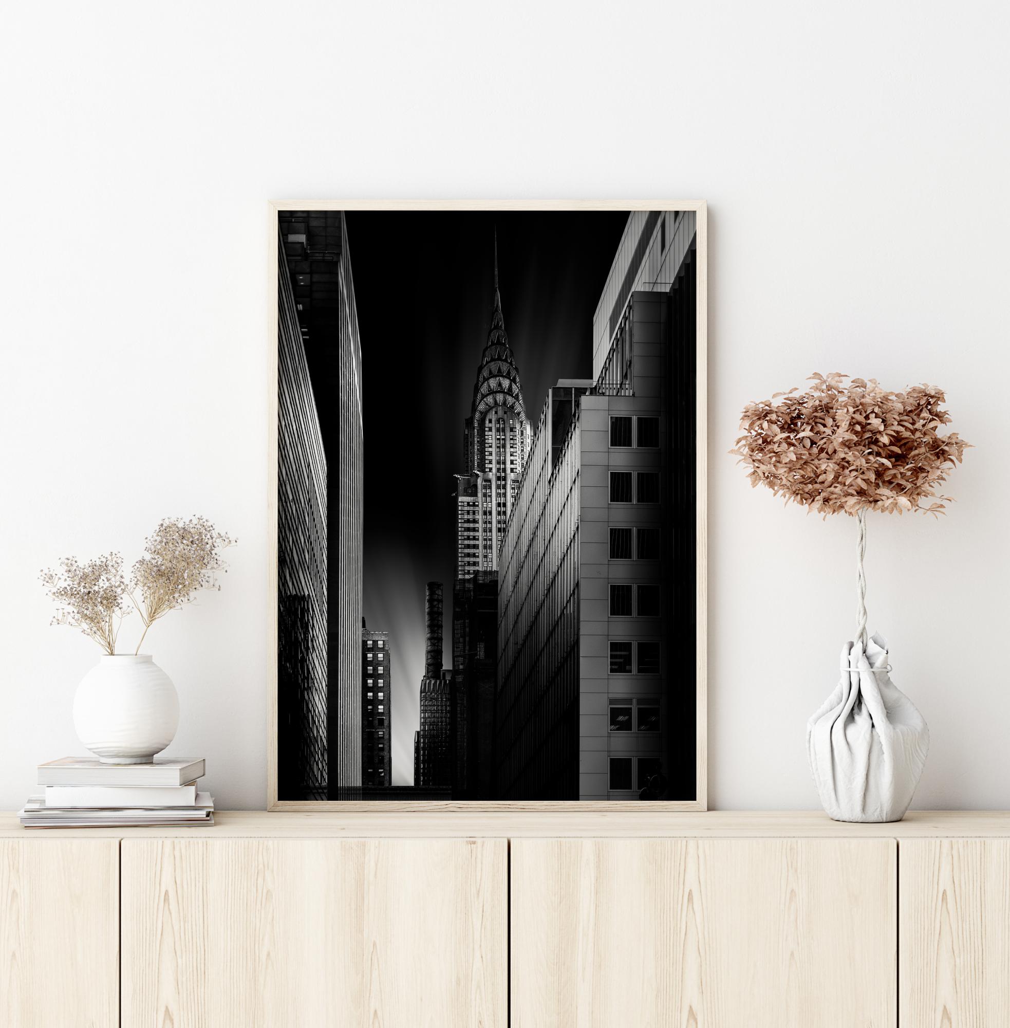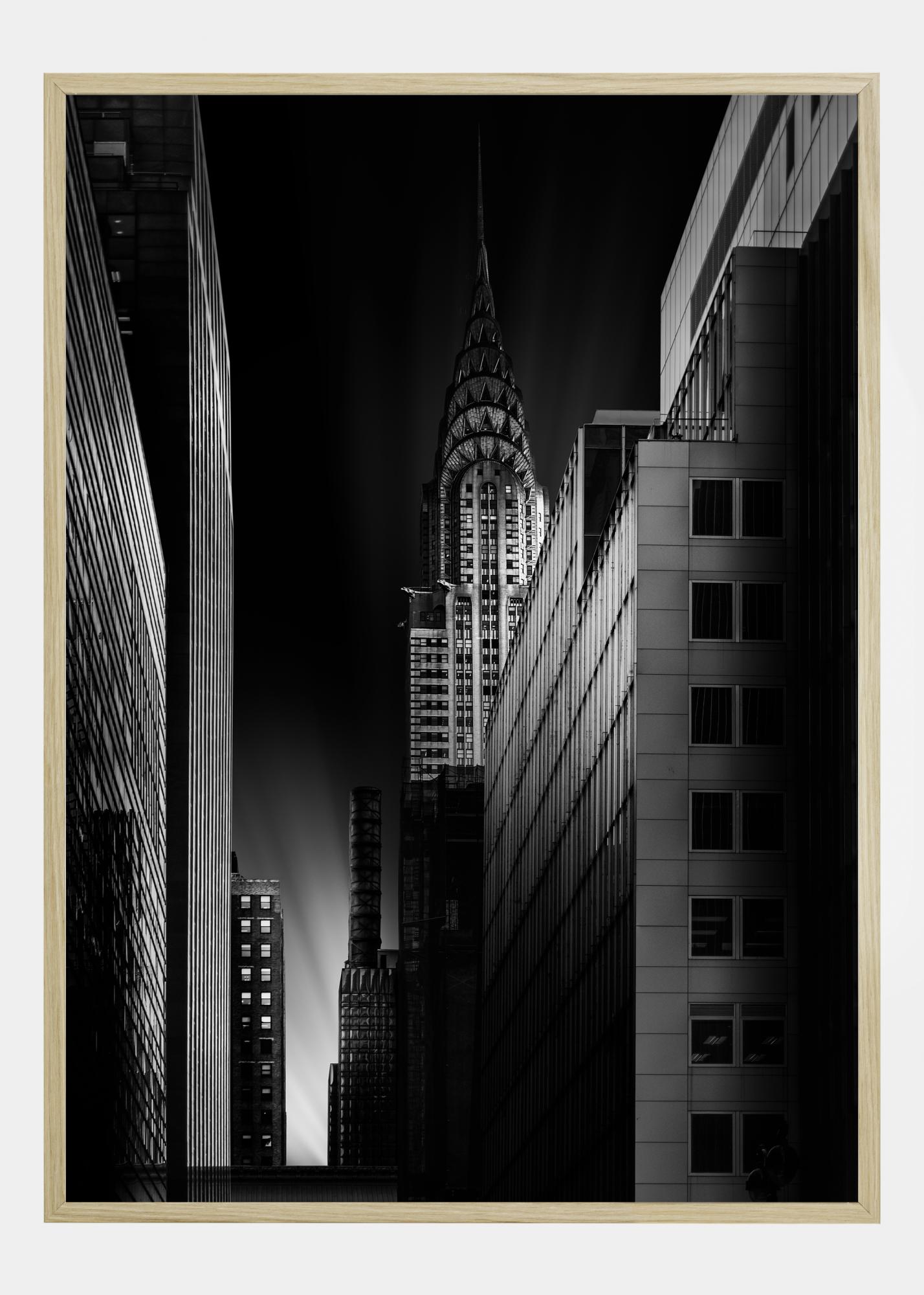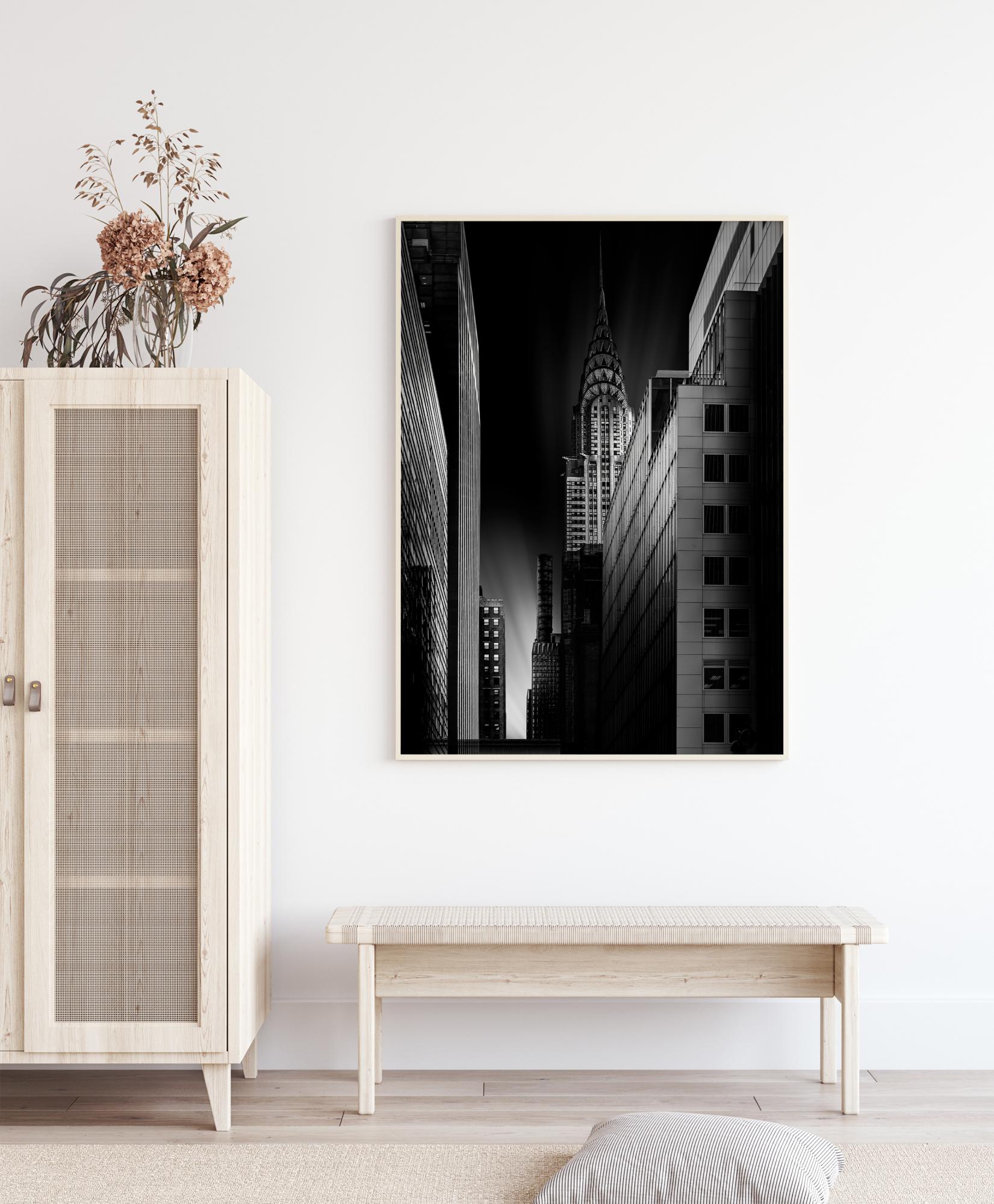Urbanistlik plakat Chrysleri hoonest öösel. Kitsas tänav juhatab pilku alla taevasse sähvatava valguseni. Paremal on näha varjutatud hoone selles mõnevõrra kõhedas fotos. Riputatud pilt valgel seinal erakunstigaleriis.