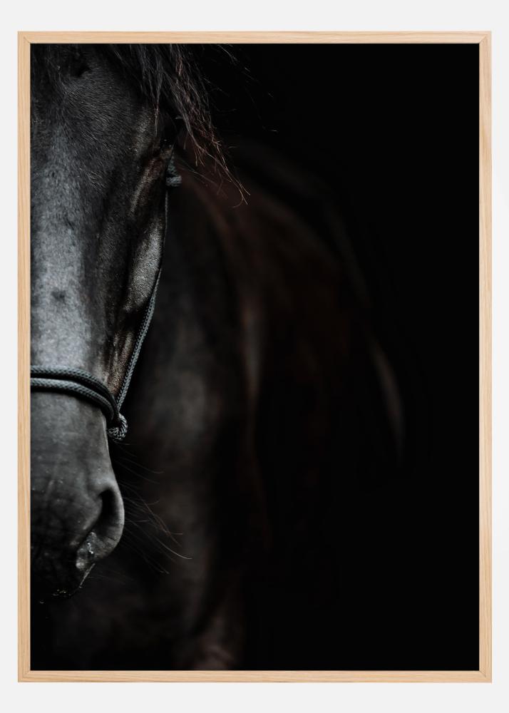 Fotograafiline plakat hobusearmastajale! Siin on pildistatud tume hobune otse eest vastu tumedat tausta. Hobuse nägu on kaunilt valgustatud, samal ajal kui keha tagumised osad sulanduvad tausta. Täienda meeleldi meie laia raamivalikuga.