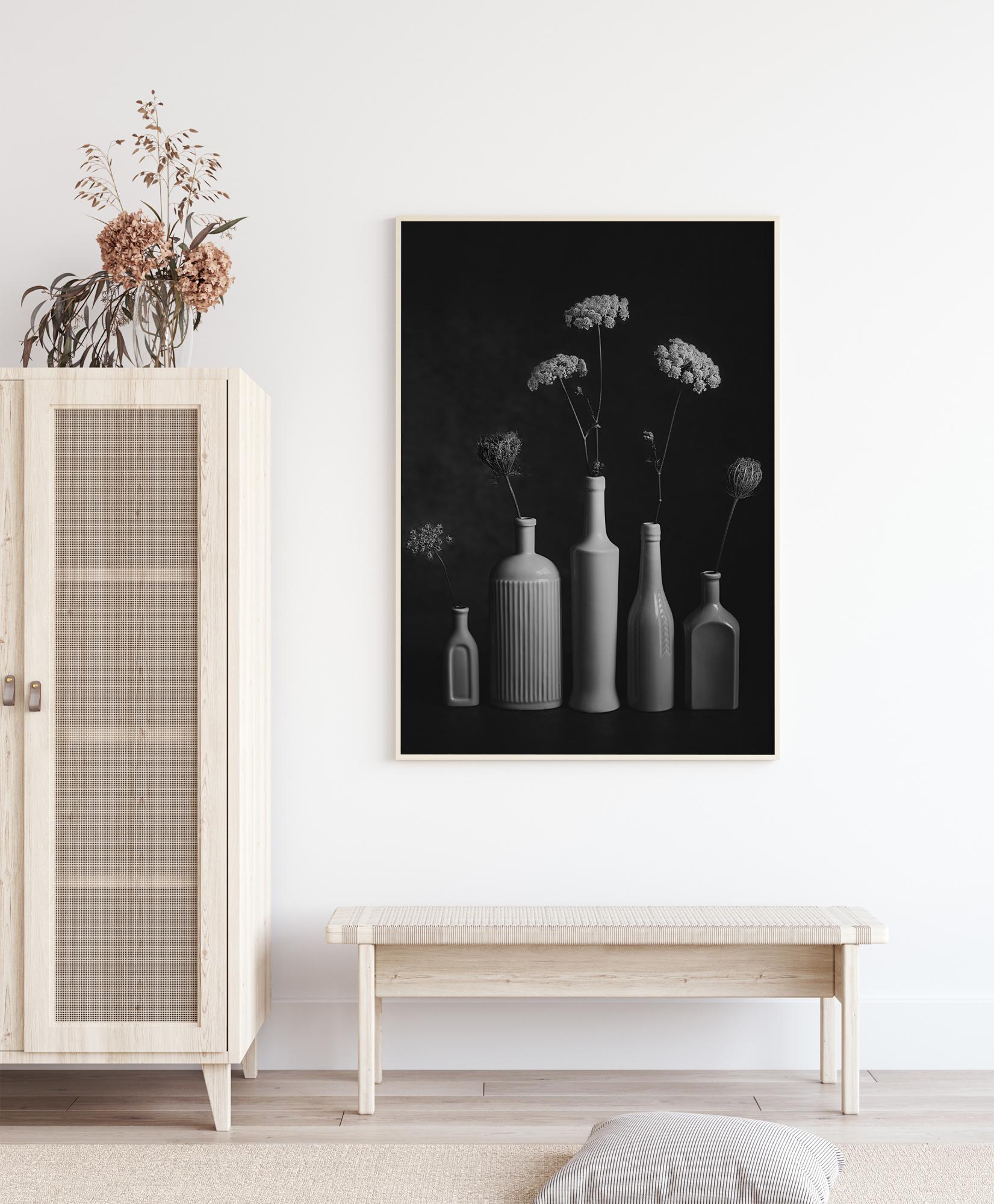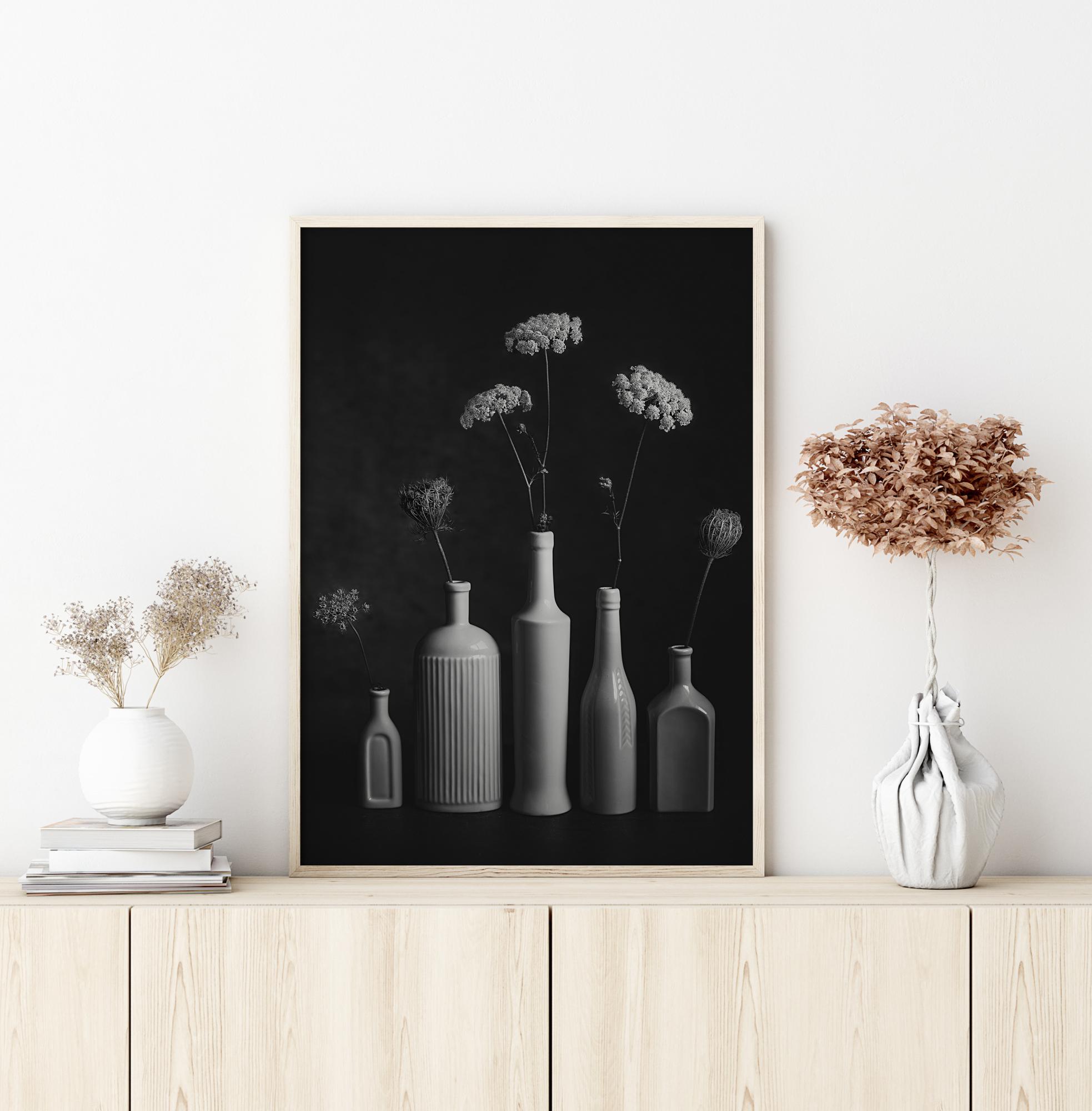 Traditsiooniline plakat, millel on pudelid ja lilled lihtsa musta tausta peal. Lisage oma koju puudutus hollandi maalikunsti stiili selle lihtsa, kuid samas mõjuva pudelite ja lillede komplektiga.