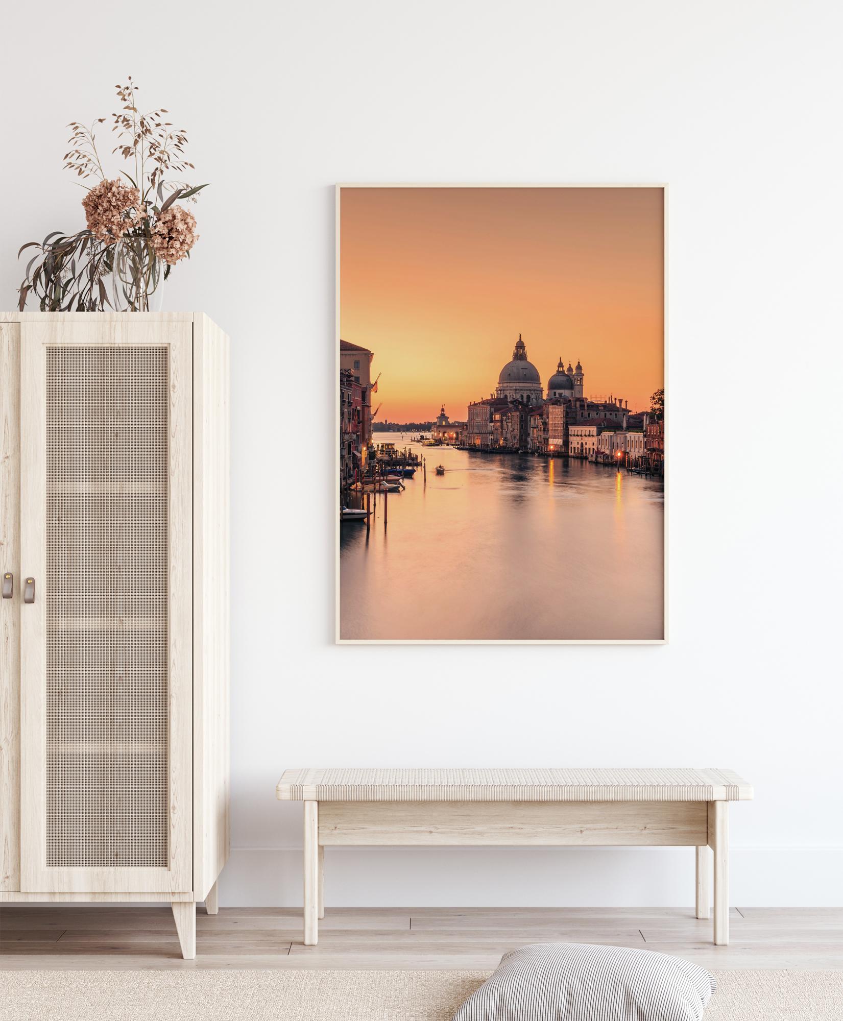 Plakat linnavaatega, kus kujutatakse koidikut Veneetsias. Lai kanal avab end ookeanile, linn paikneb mõlemal pool. Taevas on imeliselt oranž, kui päike tõuseb katedraali kohal. Tunne uue päeva soojust selle ilusa ja rahuliku pildi abil.