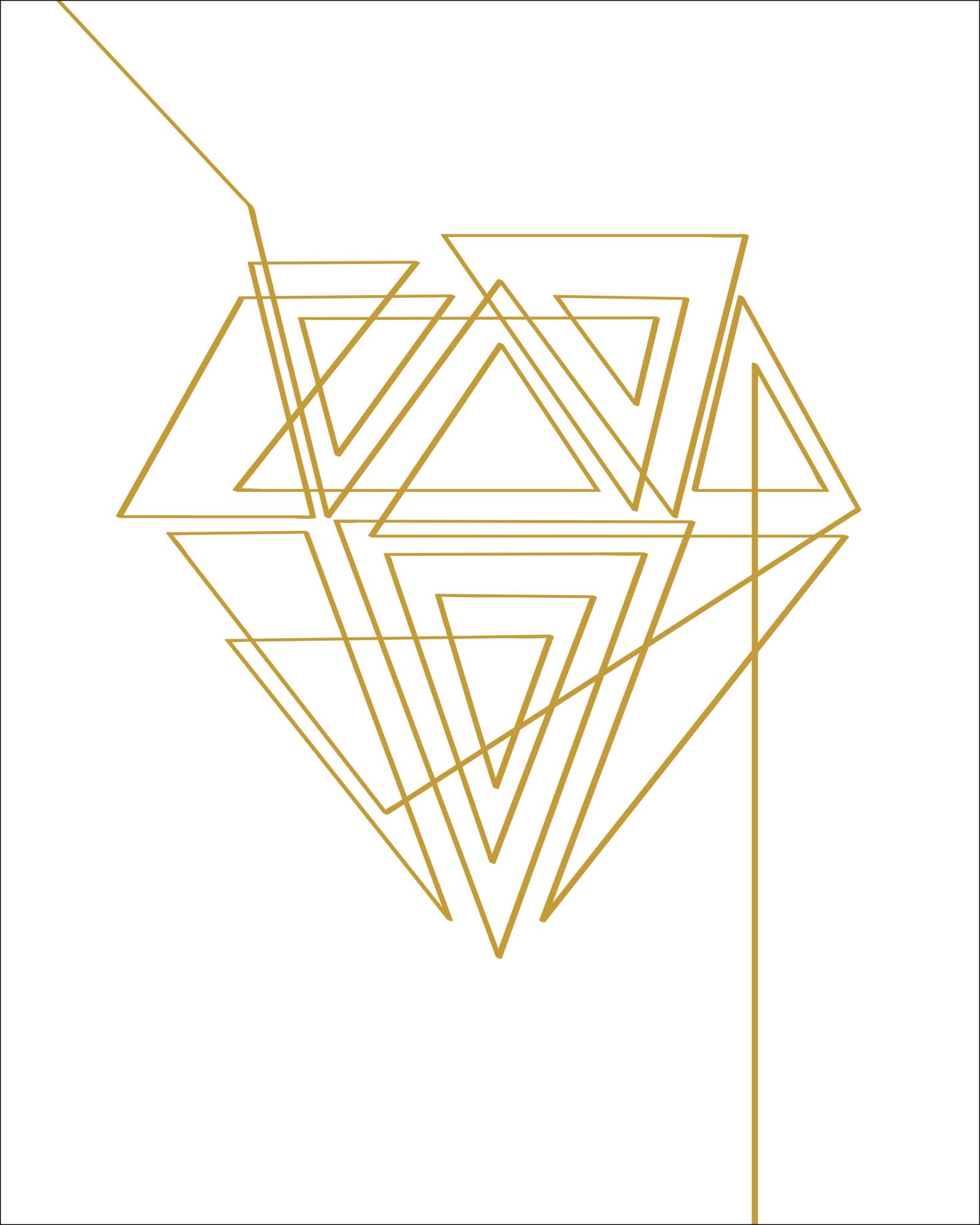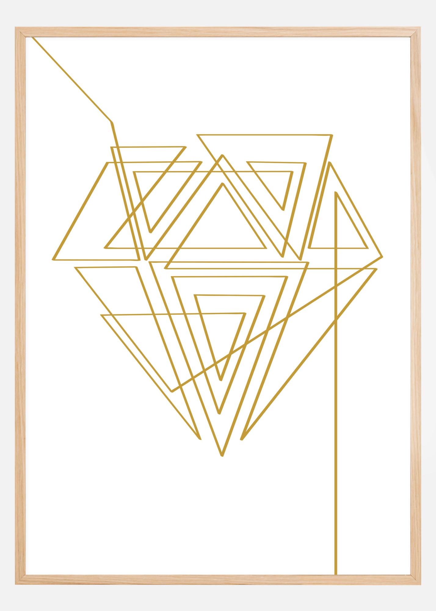 Abstraktne plakat kuldsete geomeetriliste joontega teemantiga. See teemant on keerukalt loodud mitmesugustest kolmnurksetest vormidest pikas, katkematus joonas. Jälgi joont ja vaata, kas suudad kogu mustri lahti mõtestada. Teos on loodud valgel taustal, seega sobib see kõige paremini kreemikas või kuldse värvusega seinale.