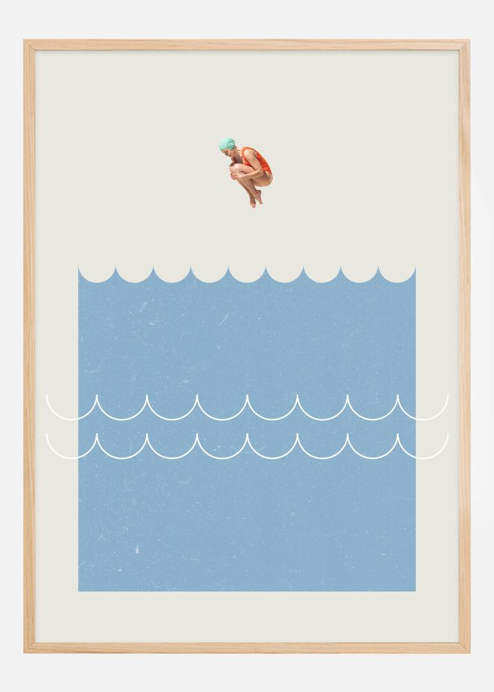 Selle plakati mänguline tõlgendus suvisest pladist näitab väikest tegelast ujumistrikoo ja ujumismütsiga, kes on vabas langemises stiliseeritud lainete illustratsiooni poole. Minimalistlik disain ühendab reaalsuse abstraktsiooniga, pakkudes loovat ja värskendavat vaatenurka klassikalisele suveajale ja ujumisrõõmule.