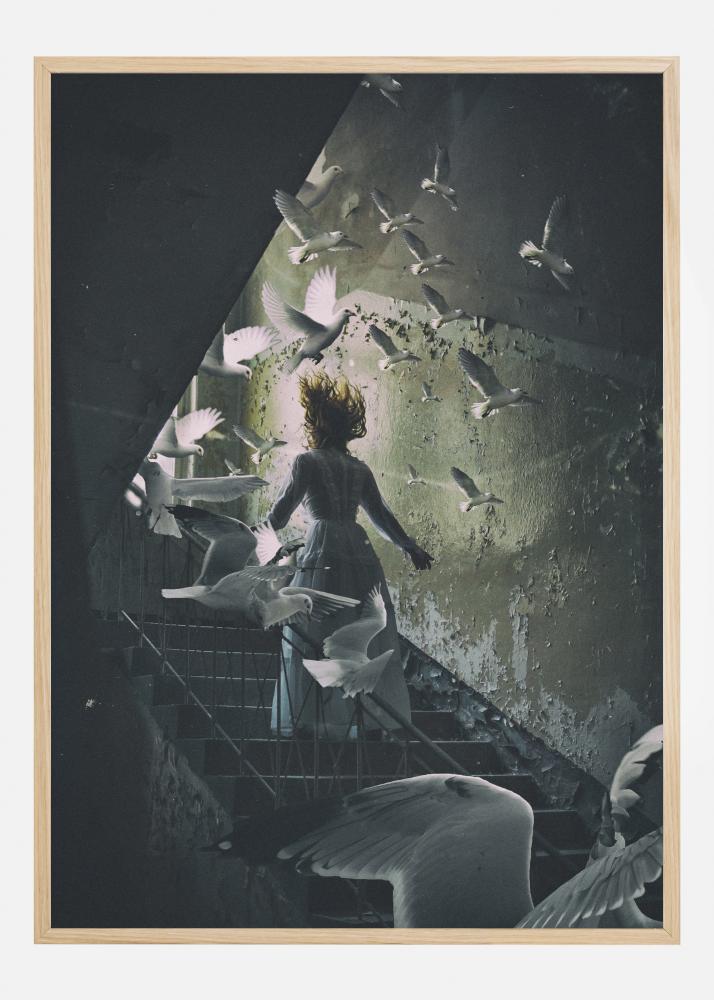 Meeldiv poster, kus tüdruk kõnnib trepist üles valgete lindude parv tema pea kohal lendamas. Hallrohelistes toonides seinad on kõrgemal heledamad. Valged tuvid lendavad ja keerutavad tüdruku juukseid. Jälgi seda neidu, kui ta lindude seas valguse poole liigub.