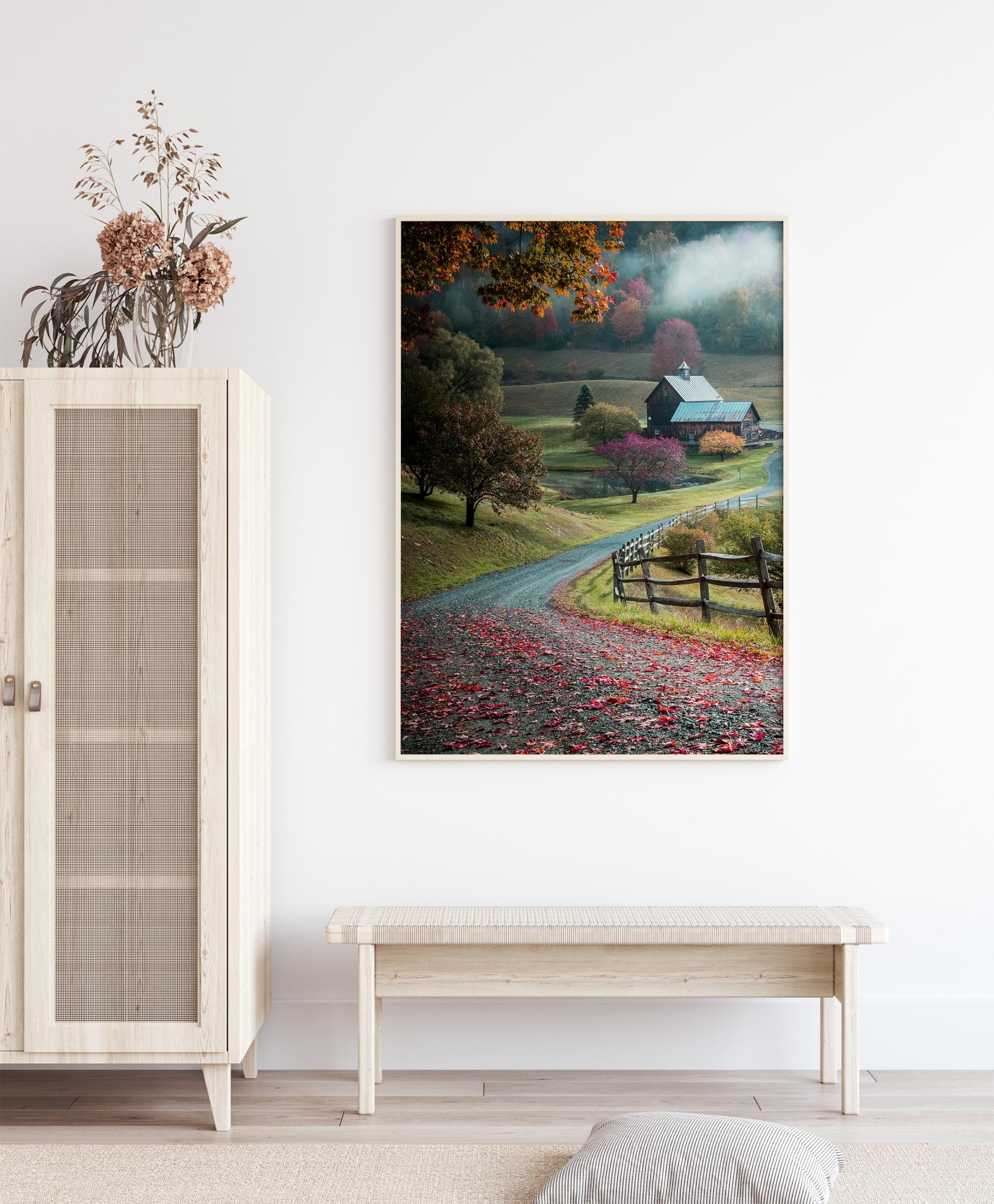 Loodusplakat maapiirkonnaga, kus on väike autotee, idülliline talu ja sügispuud. Punased lehed lebavad teel, mis viib orgu ja väikesesse majja. Päikesekiir tungib alla orgu ja valgustab puu sügislehti. Tunneta maapiirkonna võlu, kui riputad selle pildi koju.