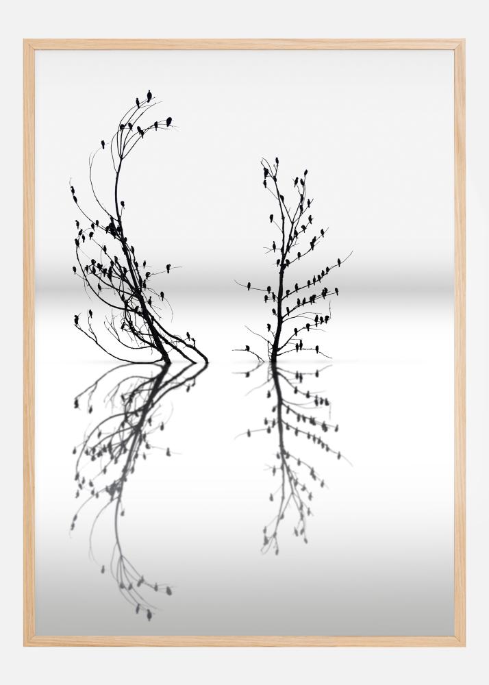Stiliseeritud plakat kahe haruga, mis ulatuvad veest. Tumedad oksad, mis on kõverad ja väänatud, viskavad oma peegeldused allolevasse rahulikku vette. Selle teose summutatud sinised ja valged toonid loovad rahuliku atmosfääri, mida saate nautida, kui see pilt kodus seinal on.