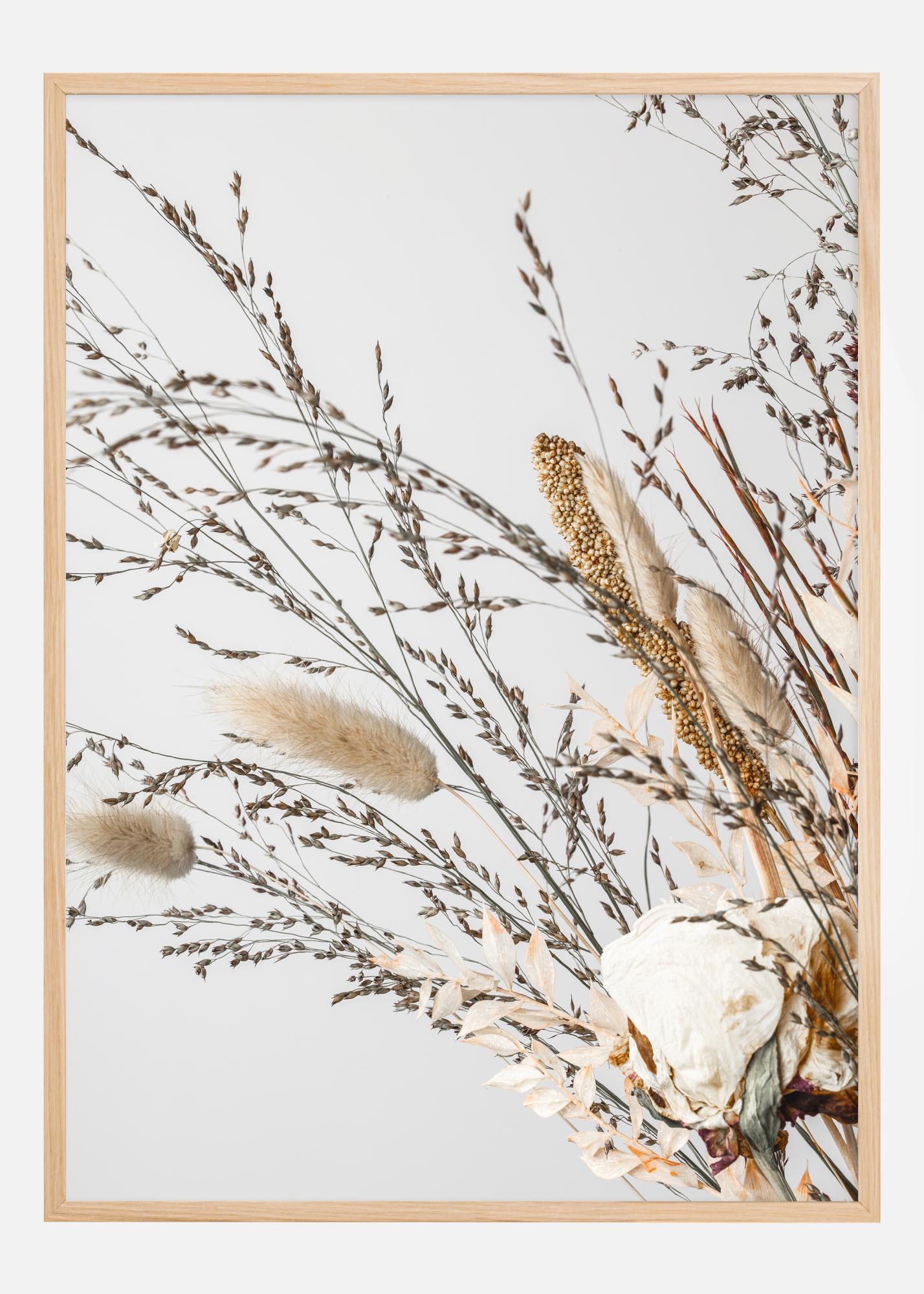See plakat on looduse vaikse elegantsi tähistamine, esitades kuivatatud taimede mitmekesist paigutust. Looduslik kompositsioon on täis peeneid jooni ja orgaanilisi vorme, alates õõtsuvatest kõrtest kuni tugevate pähikuteni ja peenetooniliste lehtedeni. Kuivatatud taimede pruun-beež palett puhtal valgel taustal annab sooja ja looduse tunde, mis on tabatud vaikuses.