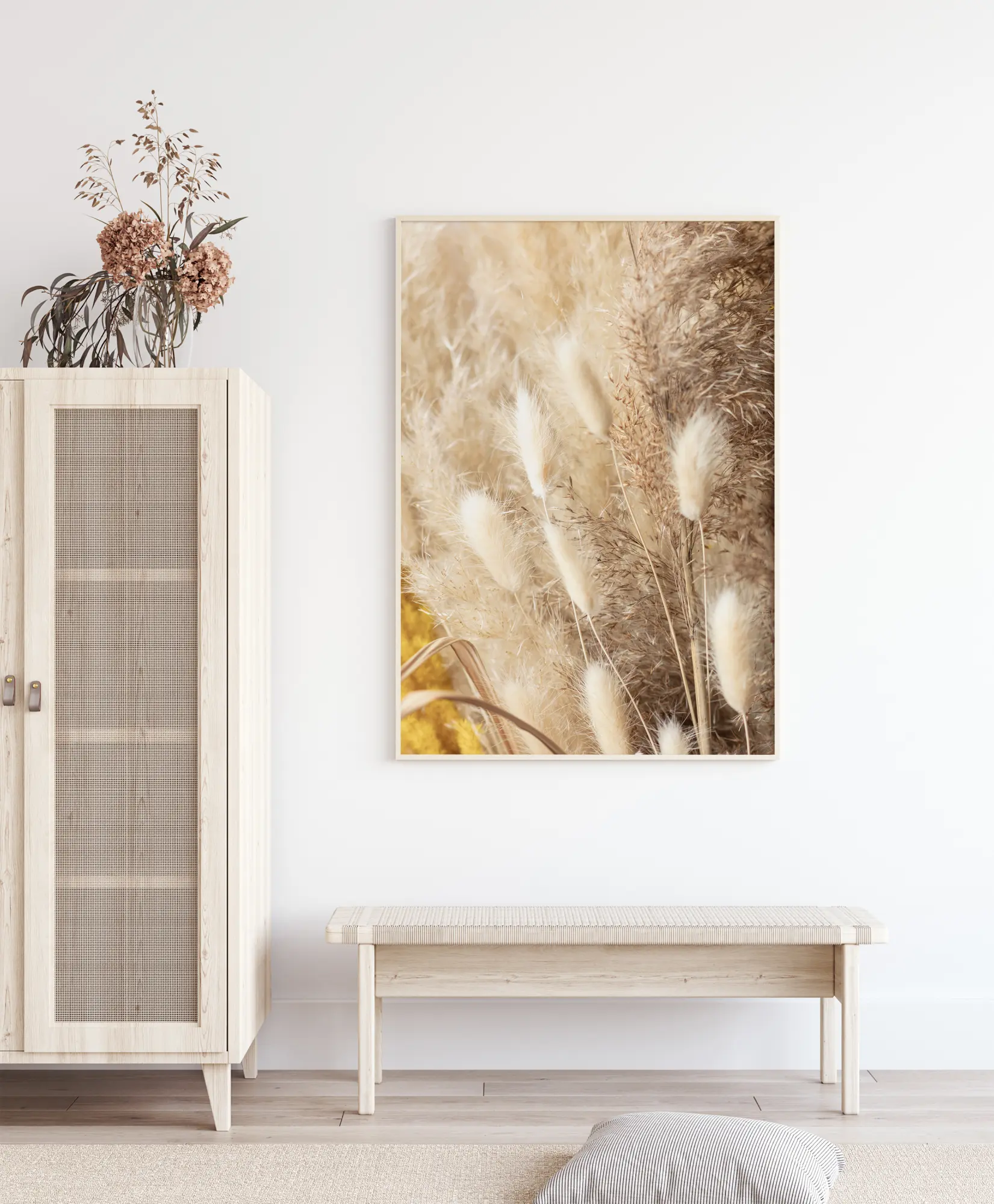 Lähivaade kuivatatud lillede kimbust. Helged, summutatud pruunid ja kollased värvid loovad tõeliselt pehme tunde. Sa võid end sellesse teosesse unistada, kui oled selle riputanud lasteaia seinale.