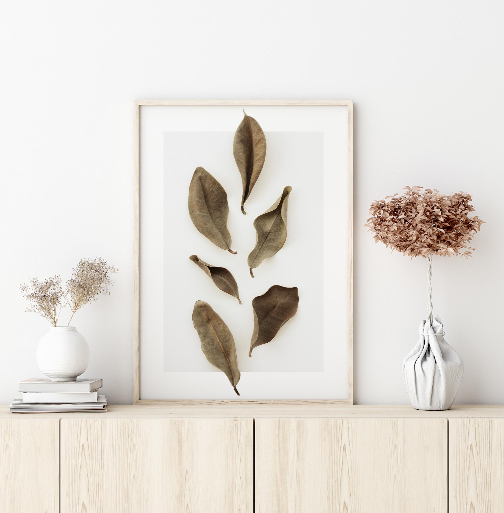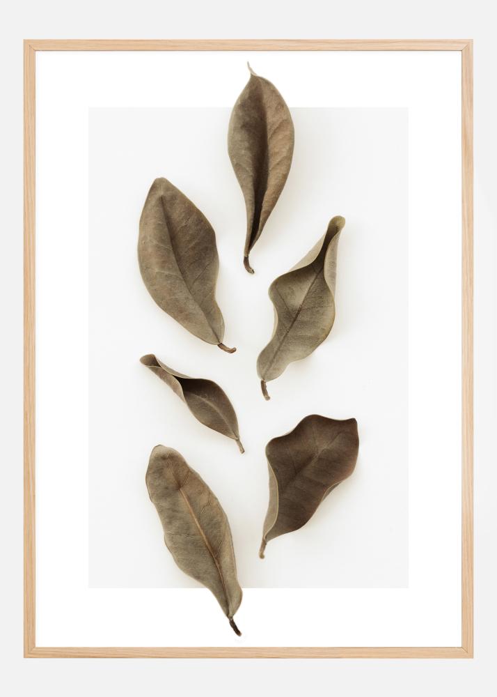Detailne plakat kuivatatud lehtedega. Kuus kuivatatud lehte on paigutatud nii, nagu need oleksid endiselt oksal valge tausta ees. Pruunid lehed on lihtsad ja tavalised, täiuslikud elava seina tugevdamiseks või mustri lisamiseks lihtsale pinnale.