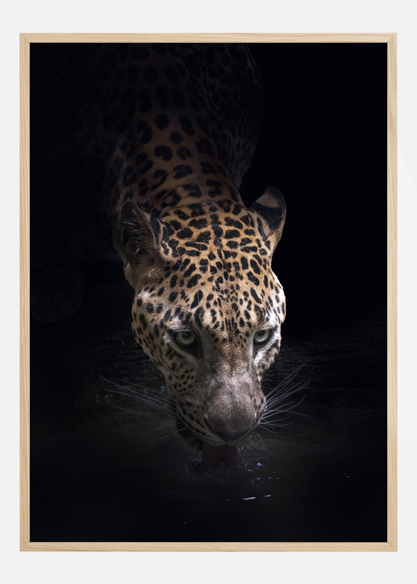 See dramaatiline poster tabab leopardi intiimsel hetkel, kui ta vaikselt vett joob, võimas metsiku looduse hetk, mis on ajas jäädvustatud. Must taust toob esile suurepärase karva kuldse värvi ja iseloomulikud laigud, luues peaaegu kolmemõõtmelise efekti. Leopard on pööratud vaataja poole pilguga, mis on täis metslooma keskendumist ja kohalolekut, luues otsese sideme loomulik ja inimesega.