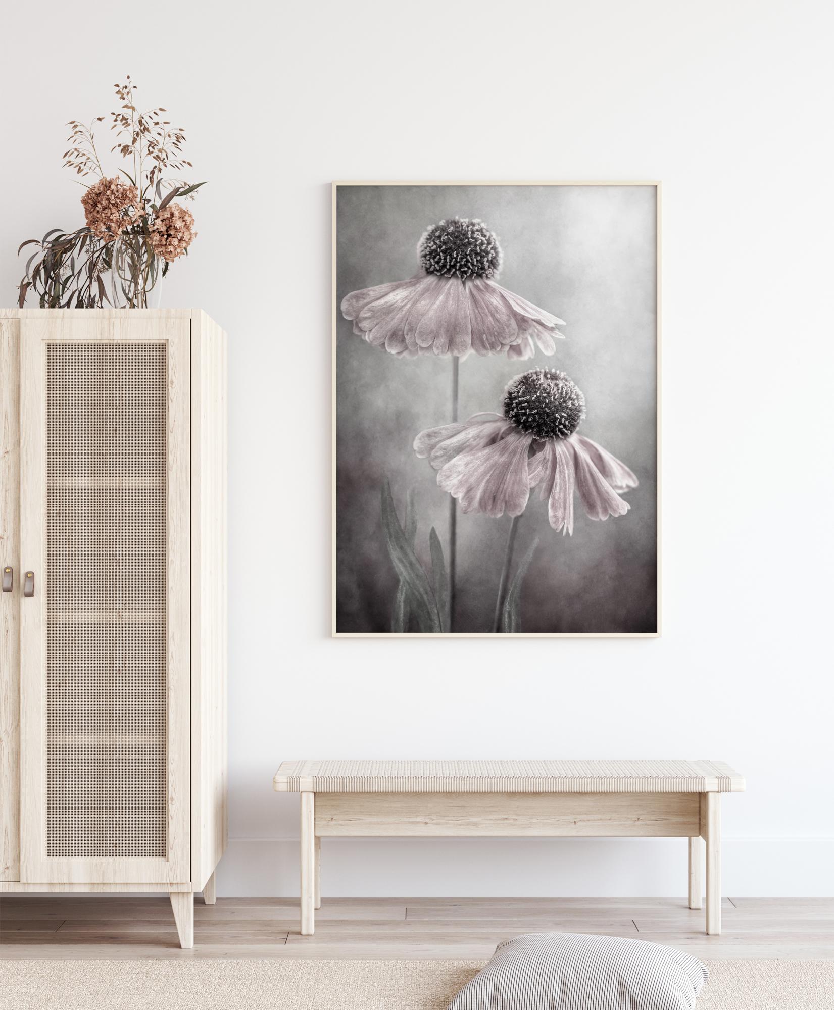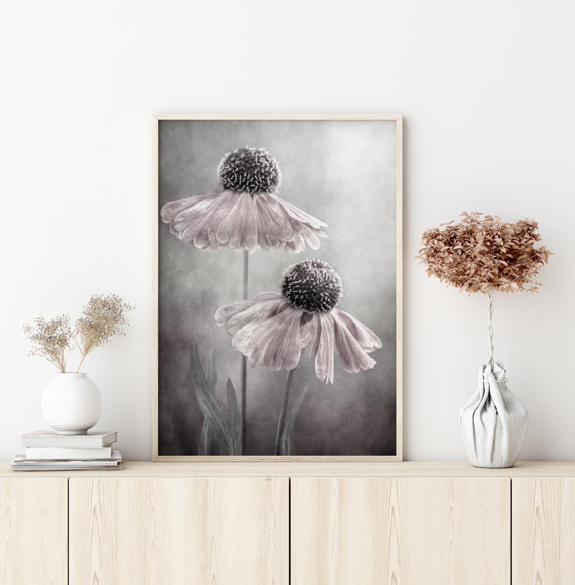Kaunis plakat kahe karikakraga, mis ulatuvad taeva poole. Karikakarde ümarast keskosast rippuvad valged kroonlehed. Taust on sumedalt halli tooniga, kus valgus kumab läbi, et luua õhustikku. Tunne selle peene plakati maagilist toimet, kui riputad selle magamistuppa.